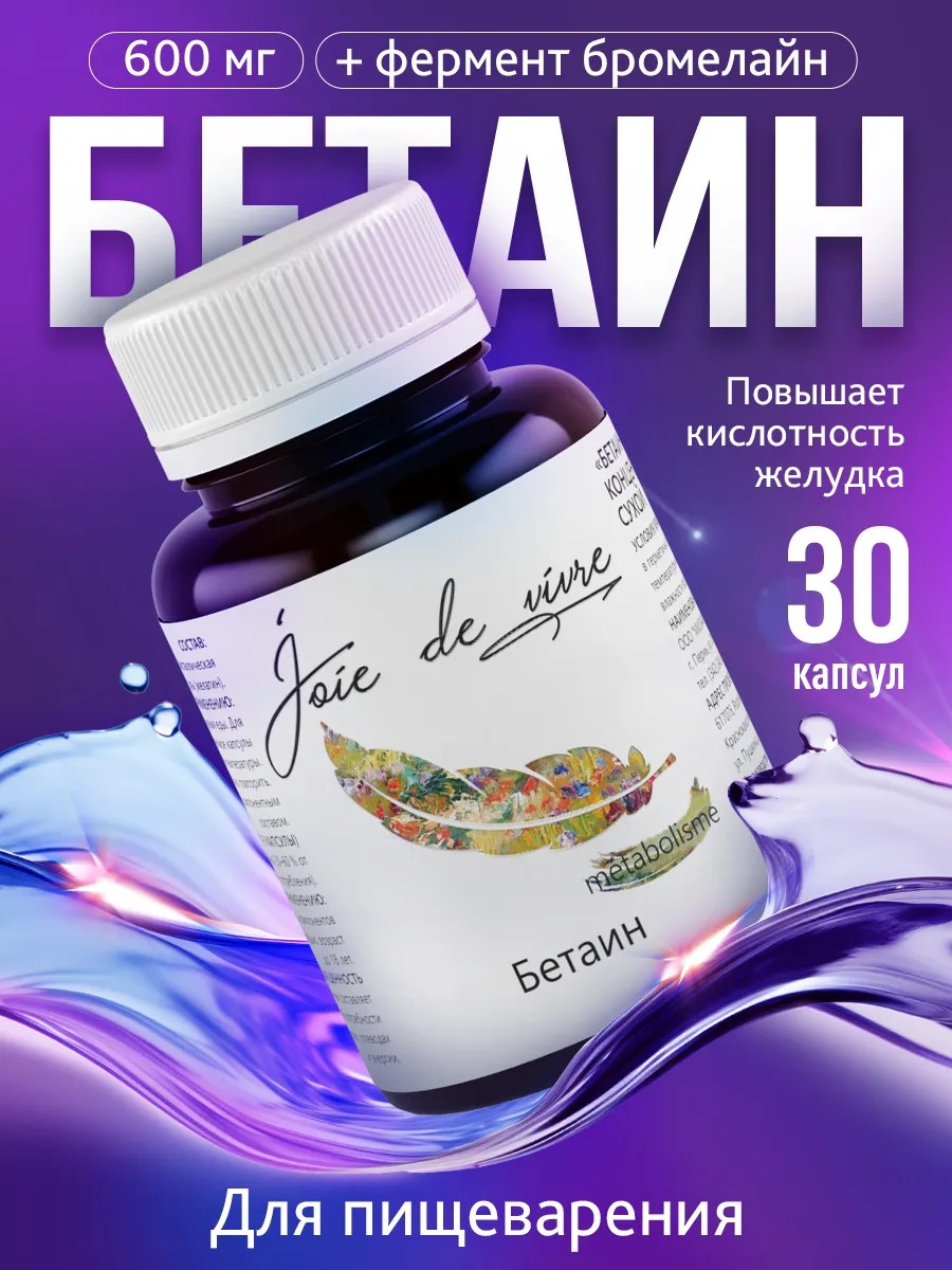 Бетаин от Joie de vivre содержит бетаин гидрохлорид, бромелайн - пищеварительные энзимы для эффективного переваривания пищи. Эти капсулы поддерживают здоровье печени, желудка и кишечника, предотвращают изжогу и другие расстройства ЖКТ. Бетаин способствует выработке глутатиона и помогает при проблемах с пищеварением. Он естественно содержится в свекле, брокколи, зернах, моллюсках, шпинате и морских водорослях, активируя синтез фосфолипидов и защищая клетки.