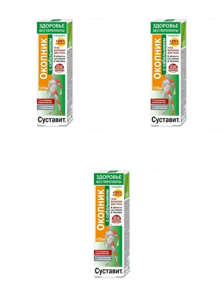 СУСТАВИТ ГЕЛЬ-БАЛЬЗАМ ОКОПНИК САБЕЛЬН 125МЛСуставит Окопник (сабельник) гель-бальзам для тела - эффективное средство на основе природных компонентов.Внешний вид: Консистенция умеренно жидкая, цвет от прозрачно-белого до коричневого, запах умеренно выраженный.Сабельник болотный (Comarum palustre) обладает многочисленными лечебными свойствами.При воздействии на суставы оказывает биостимулирующее, антибактериальное, обезболивающее, противовоспалительное действие, способствует выведению солевых отложений, стимулирует восстановление хрящевой ткани.Окопник (живокост) известен в медицине около 2 тысяч лет. Способствует восстановлению поврежденных тканей, особенно костных, отсюда и родовое название растения Symphytum officinale (греч.) - сращивать, соединять.Стимулирует регенерацию костной и хрящевой ткани при заболева-ниях суставов, улучшает качество синовиальной жидкости, заживляет суставные микротравмы, ускоряет сращивание костей при переломах. Корни содержат рекордное количество аллантоина, полисахариды, алкалоиды, гликозиды, полифенолы, тритерпеновые сапонины, фитостерины, танины, кумарины, органические кислоты.Хондроитин и Глюкозамин - являются основными составляющими хрящевой ткани и естественными защитниками клеток хряща.Совместное применение хондроитина и глюкозамина обеспечивает более высокое насыщение организма хондропротекторами по сравнению с действием одного компонента, а также более выраженный эффект.Хондропротекторы обеспечивают питание и жизнеспособность суставов, тормозят деградацию и стимулируют восстановление хрящевых тканей.Девясил, Зверобой и Лопух - мощные биогенные стимуляторы с широким спектром лечебного действия. Ускоряют восстановление и самовосстановление клеток хрящевых тканей.РезультатУменьшение болевого ощущения в суставах и мышцахгель-бальзам наносить круговыми массирующими движениями на проблемную область в течение 3-5 минут до полного впитывания 2-3 раза в день. По возможности обеспечить суставу тепло и покой в течение 1-2 часов. Ми