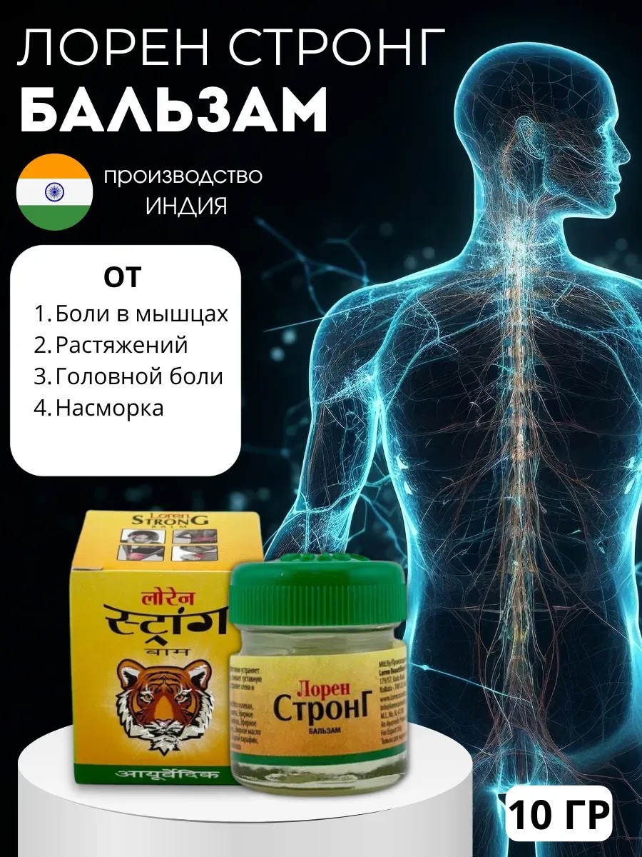 Бальзам Лорен Стронг быстродействующий аюрведический препарат.. Уникальная запатентованная формула из травяных масел обладает разогревающим эффектом. Эфирные травяные масла глубоко проникает в ткани, быстро снимают суставные и мышечные боли, устраняют отек и воспаление. Средство отлично помогает при насморке его можно применять при любых видах хронических ревматических болей. Он справляется с воспалениями при вывихах, ушибах, растяжениях мышц и связок. При сильных болях втирать мазь в течение 5-10 мин. в больную область. Затем укутать шерстяной или другой теплой тканью. Эффективно помогает при насморке, боли в горле и при головной боли. При рините смажьте носовые пазухи, переносицу и горло небольшим количеством бальзама. На ночь, перед сном, нанесите препарат на грудь, втирайте его 5 минут, после чего, укутайте. Примигрени смажьте виски и лоб и отдыхайте.