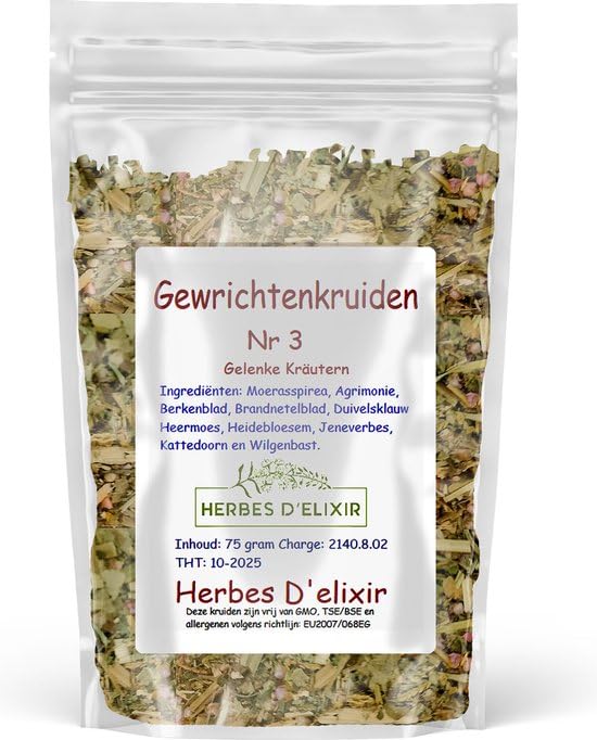 Joint herbs (no. 3) is a delicious herbal tea that has been specially formulated to help you reduce stiff joints and stiffness. This tea comes in a 75 gram package and contains a unique mix of natural ingredients such as meadowsweet, agrimonia, birch leaf, devil's claw, heather blossom, juniper berry, cat's thorn root, willow bark, nettle and horsetail. By drinking a cup of this herbal tea daily, you can experience the benefits over time. It is easy to prepare: take a full teaspoon of herbs three times a day, put it in a sieve and pour boiled water over it. Let the tea steep for 5 to 10 minutes for optimal taste and effect. The longer you let the herbs steep, the more active substances are released into the water. You can also make a larger batch of tea to enjoy throughout the day, which will help you stay hydrated. Remember that joint herbs are a nutritional supplement and not a medicine. At Herbes D'elixir we make our herbs using traditional methods and ensure that they are safe for use. The herbs are processed within Europe and are provided with analyzes and certificates. Enjoy the benefits of this herbal tea and give your joints the support they need! INGREDIENTS Meadowsweet, Agrimonia, Birch leaf, Devil's claw, Heather blossom, Juniper berry, Catthorn root, Willow bark, Nettle, HorsetailGewrichten Kruiden Kruidenthee - 75 Gram - Natuurlijke Ingrediënten Voor Stijve Gewrichten - Voedingssupplement Gewrichten kruiden (nr. 3) is een heerlijke kruidenthee die speciaal is samengesteld om je te helpen bij het verminderen van stijve gewrichten en stramheid. Deze thee komt in een verpakking van 75 gram en bevat een unieke mix van natuurlijke ingrediënten zoals moerasspirea, agrimonia, berkenblad, duivelsklauw, heidebloesem, jeneverbes, kattendoornwortel, wilgenbast, brandnetel en heermoes. Door dagelijks een kopje van deze kruidenthee te drinken, kun je na verloop van tijd de voordelen ervaren. Het is eenvoudig te bereiden: neem drie keer per dag een volle theelepel kruiden, doe deze in een zeefje en giet er gekookt water overheen. Laat de thee 5 tot 10 minuten trekken voor een optimale smaak en werking. Hoe langer je de kruiden laat trekken, hoe meer werkzame stoffen in het water komen. Je kunt ook een grotere hoeveelheid thee maken om de hele dag van te genieten, wat je helpt om meer vocht binnen te krijgen. Vergeet niet dat gewrichten kruiden een voedingssupplement is en geen medicijn. Bij Herbes D'elixir maken we onze kruiden op ambachtelijke wijze en zorgen we ervoor dat ze veilig zijn voor gebruik. De kruiden worden binnen Europa verwerkt en zijn voorzien van analyses en certificaten. Geniet van de voordelen van deze kruidenthee en geef je gewrichten de ondersteuning die ze nodig hebben! INGREDIËNTEN Moerasspirea, Agrimonia, Berkenblad, Duivelsklauw, Heidebloesem, Jeneverbes, Kattendoornwortel, Wilgenbast, Brandnetel, Heermoes