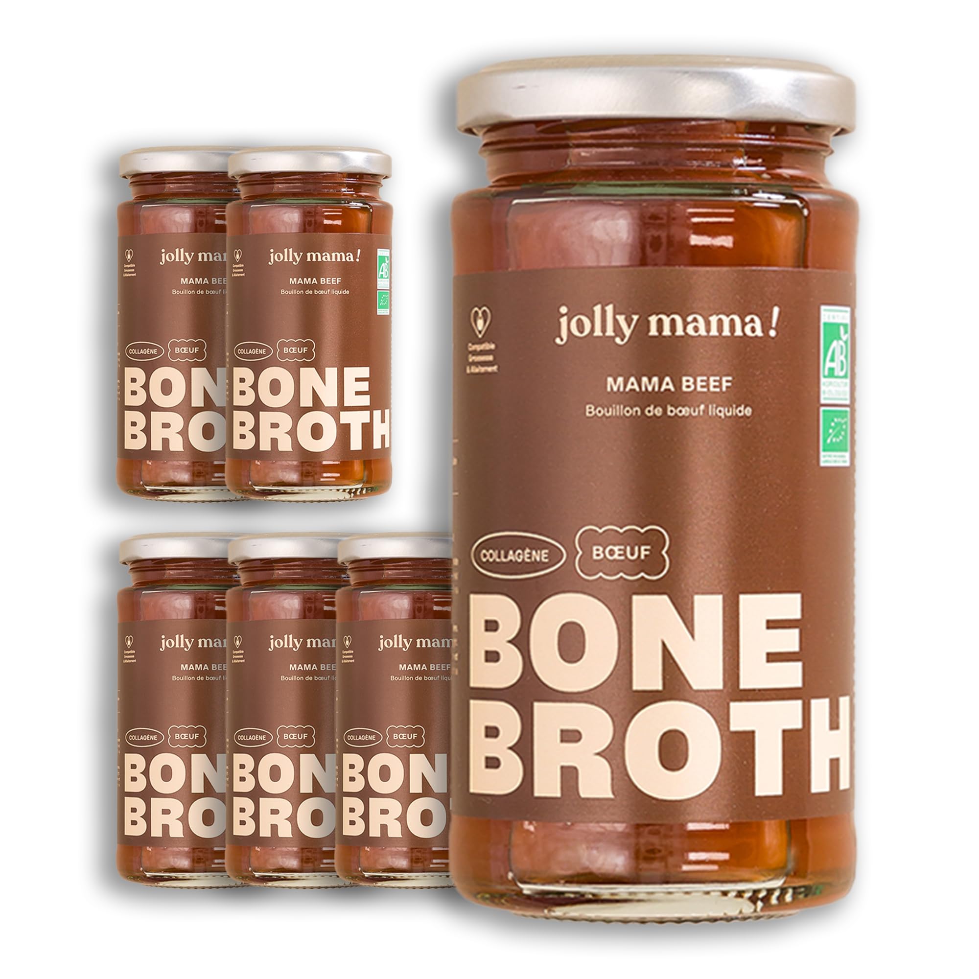 L'ENGAGEMENT BIEN-ÊTRE AU NATUREL : Chez Jolly Mama, nous croyons en une nutrition saine et bienveillante pour accompagner les femmes à chaque étape de la maternité – du projet bébé à la grossesse, du post-partum à l'allaitement, et après. Formulés avec soin et pensés pour les besoins réels des mamans, nos produits allient expertise, qualité et transparence pour vous offrir un soutien jour après jour. DÉGUSTATION : A boire BIEN chaud pour un bouillon réconfortant. Fait des merveilles dans la préparation de plats, comme le risotto ou les ramens. Réchauffer le bouillon à la casserole, à feu doux. Mama Beef peut aussi se réchauffer au micro-ondes, dans son pot, en ayant pris soin d'enlever le couvercle, ou dans un tasse, pendant 1 minute 30 à 700W. 100 BON ET BIO : Notre bouillon est composé à 100 d'ingrédients issus de l'agriculture biologique. Il est cuisiné à partir d'os de bœuf, aux petits oignons, carotte, céleri, gingembre, romarin. Sa cuisson douce, pendant des heures, a permis d'extraire tous les bienfaits (collagène, protéines, etc). 150g de bœuf et 10g de veau pour 100ml de bouillon. Sans conservateurs et sans gluten. Fabriqué en France. BIENFAITS DURANT TOUTE LA MATERNITE : Réconfortant et reminéralisant, Mama beef est idéal pendant la grossesse, l'allaitement et le post-partum. Durant la grossesse et l'allaitement, il répond aux besoins accrus en protéines qui contribuent au maintien et à l'augmentation de la masse musculaire. Hyper rapide à préparer, il est traditionnellement utilisé durant le postpartum pour régénérer les tissus et se faire du bien. BOUILLON DE BOEUF BIO HAUTEMENT CONCENTRÉ EN COLLAGÈNE : Mama beef est un bouillon de bœuf 100 bio. Il bénéficie d'une teneur exceptionnelle en collagène, avec 15g par portion. Le collagène est une protéine qui structure le corps. Mama beef est la solution idéale pour toutes les femmes qui souhaitent consommer du collagène, de façon saine, naturelle, et savoureuse ! Lot de 6 bouillons de 240ml.