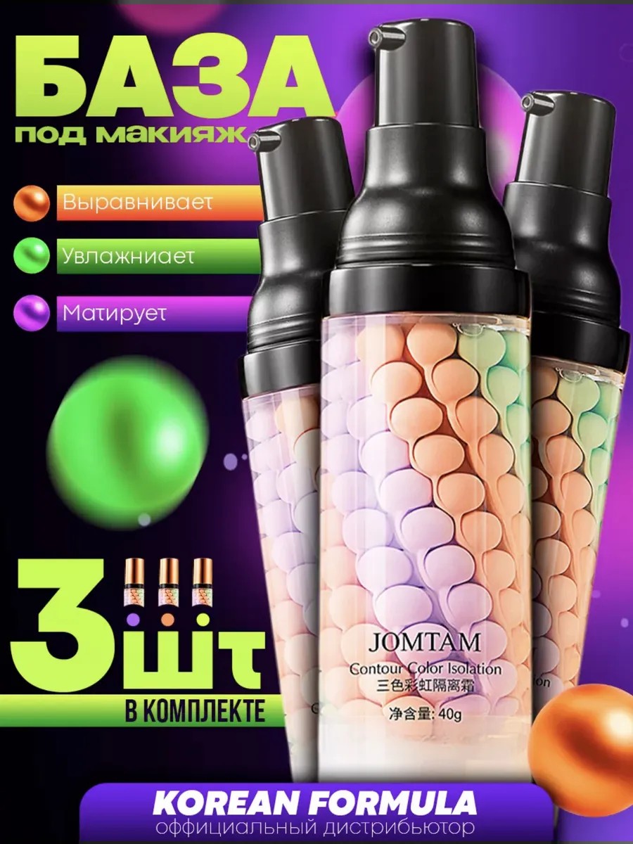 База для лица трехцветная- это три средства в одном, которые гармонично взаимодействуют и позволяют добиться идеально-нежной, бархатной кожи без видимых следов маскирующего средства, Он одновременно выравнивает тон, улучшает структуру и рельеф кожи. Трёхцветная выравнивающая основа под макияж или база под макияж имеет три тонирующих цвета, которые идеально скрывают все недостатки по тону и текстуре кожи. Работает как корректор, после него вы наносите тональный крем и косметику ещё экономичнее. Нормализует работу сальных желез, увлажняет, придает ровный рельеф коже и скрывает поры. Трёхцветный праймер для лица jomtam 3в1 отлично подойдёт для лета так как имеет кремообразную консистенцию. Основа для макияжа состоит из трёх цветов, которые при нанесении смешиваются и работают по всему лицу. Фиолетовый - убирает желтизну лица. Зелёный - нейтрализует красноту, воспаления и раздражения Розовый - скрывает неровности кожи даёт мягкий ровный тон.