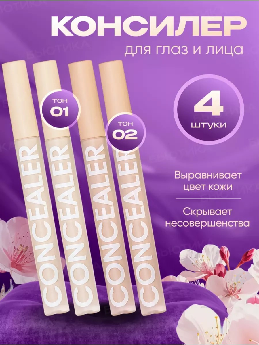 This 4-piece concealer set is an excellent tool for creating flawless makeup in shades 01 and 02. Its dense, creamy contouring texture quickly conceals imperfections, including pigmentation and dark circles. This creamy foundation concealer also effectively conceals pores and evens out skin tone, creating a matte finish and a smooth contour. The tapered tip of the applicator allows for precise application of the contouring product, while its lightweight, flexible texture won't clog or dry out the skin under the eyes. This liquid, long-lasting concealer stick is also ideal as a makeup base and eyeshadow. This corrective cosmetic with a brush is suitable for all skin types: oily, dry, and age-prone. The concealer contains collagen, which moisturizes and prevents dryness and flaking. This product will help you achieve a lifted, open-eyed look, while also eliminating dark circles, pimples, freckles, redness, and wrinkles. Your face will look radiant and fresh all day long. This professional women's cosmetic is an excellent and effective makeup and beauty product for girls and women of all ages, including teenagers. Therefore, this concealer stick makes a wonderful gift for women on holidays like birthdays, Women's Day, or simply as a present for a mother, sister, daughter, friend, or wife.