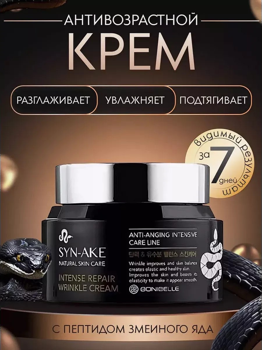 Интенсивный крем против морщин с пептидом змеиного яда. Инновационный крем с синтетическим пептидом Syn-ake, действие которого подобно змеиному яду гадюки снижает уровень работы мимической мускулатуры. Этот компонент безопасно воздействует на кожу лица, позволяет без применения уколов или хирургического вмешательства заметно омолодить кожу, разгладить морщины и предупредить появление новых. Syn-Ake синтетический пептид, по своему действию похожий на действие яда храмовой гадюки. Подобно тому, как парализуются мышцы человека после укуса змеи, пептид Syn-Ake блокирует нервные импульсы, благодаря чему мышцы лица не сокращаются, происходит их расслабление. Это приводит к постепенному разглаживанию мелких и средних мимических морщин, а также к уменьшению интенсивности глубоких.