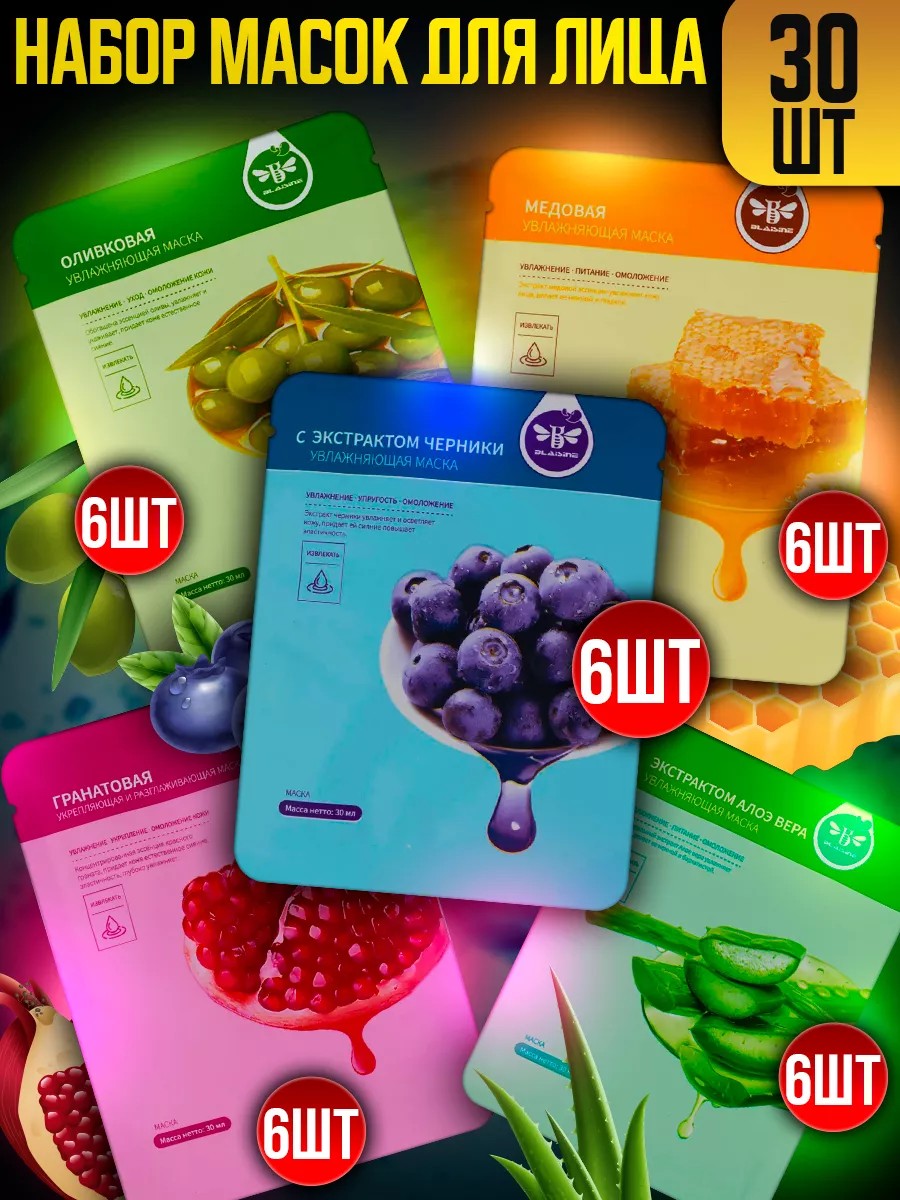 Тканевые маски для лица – ваш ключ к идеальному уходу за кожей! Насладитесь уникальным опытом увлажнения, питания и омоложения с нашим набором из 30 косметических масок, созданных специально для комплексного оздоровления кожи. Каждая маска в этом бьюти боксе обладает своими уникальными свойствами и неповторимым ароматом, чтобы вы могли насладиться разнообразием ухода. Гранатовая маска Pomegranate ГРАНАТ замедляет процесс старения и обновляет клетки эпидермиса, медовая Honey МЕД глубоко очищает и увлажняет, оливковая Olive ОЛИВКИ снимает сухость и дискомфорт, черничная Blueberry ЧЕРНИКА ухаживает и увлажняет, а АЛОЭ ВЕРА Aloe Vera тонизирует и повышает уровень эластичности. Специально разработанные формулы и, входящие в состав, компоненты позволяют бороться с различными проблемами: от черных точек и прыщей до сухости и морщин. Они питают, повышают эластичность и восстанавливают кожу, делая ее гладкой, нежной и сияющей. Каждая масочка пропитана увлажняющими и питательными компонентами, которые активно воздействуют на кожу, делая процедуру ухода максимально эффективной и приятной. Просто наденьте маску на лицо, расслабьтесь и наслаждайтесь моментом ухода за собой. Сделайте вашу кожу красивой, счастливой и здоровой с помощью нашего оздоровительного комплекса и позвольте себе роскошный уход, которого вы заслуживаете каждый день!