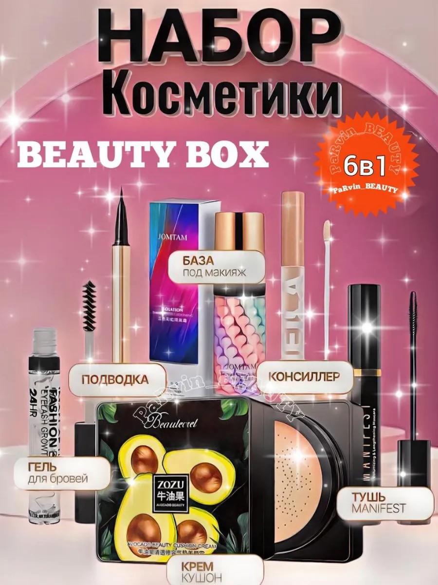 Комплектациятушь 1шт; консилер 1шт; кушон 1шт; гел для бровей 1шт; база 1шт; подводка 1шт