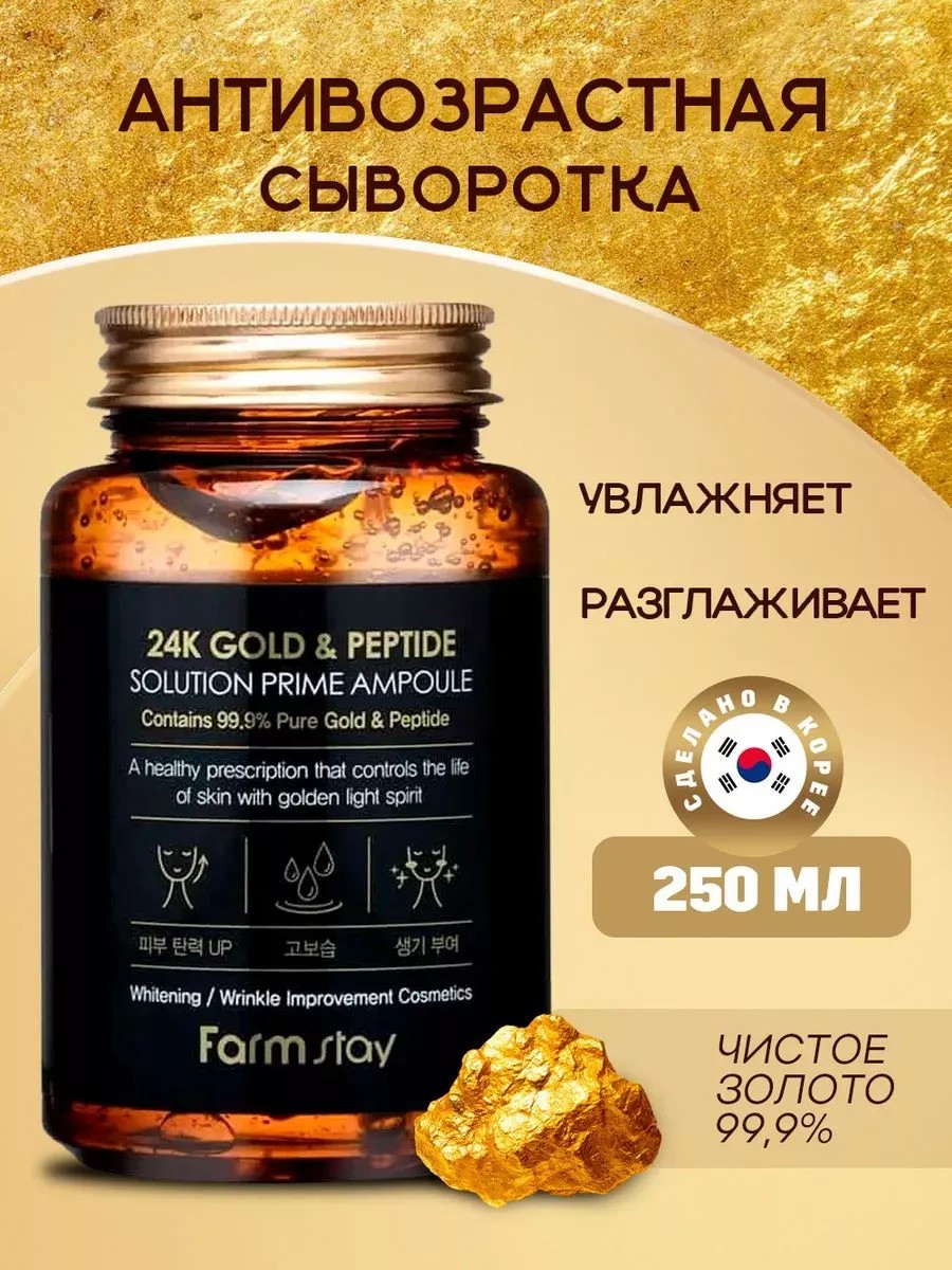 FARM STAY 24K Gold & Peptide Solution Prime Ampoule – это антивозрастная сыворотка для лица от корейского бренда Фарм Стей. Эта увлажняющая и омолаживающая сыворотка разработана с использованием пептидов и коллагена, что делает ее идеальным средством для борьбы с морщинами и увлажнения кожи. Благодаря применению золота, эта ампульная сыворотка обладает лифтинг-эффектом и помогает сократить отеки век, избежать мешков. Комбинация гиалуроновой кислоты, питательных веществ и натуральных ингредиентов, таких как аргирелин и прополис, делает эту сыворотку профессиональным средством для красоты и здоровья, ухода за кожей и улучшения ее внешнего вида. Она также помогает осветлить пигментные пятна, темные круги под глазами и улучшить текстуру кожи. Идеальная антивозрастная женская косметика против глубоких мимических морщин. Для кожи, которая нуждается в омоложении и восстановлении. Идеальный новогодний подарок жене, маме, бабушке, подруге, девушке, сестре на праздник, день рождения и новый год 2025. Соберите подарочный набор уходовой косметики и порадуйте себя и близких в новогоднюю ночь.