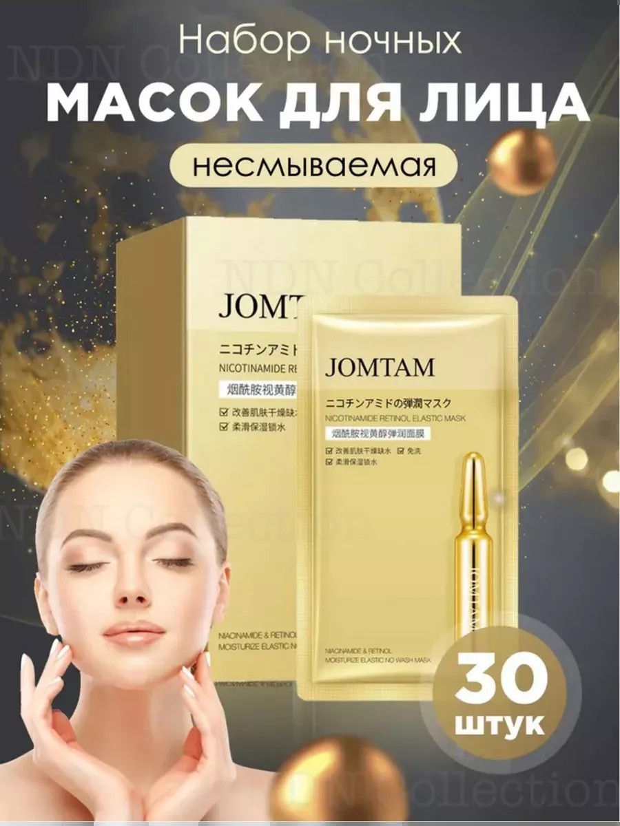 Маска для лица - это несмываемая питательная маска, с ниацинамидом, которая обладает подтягивающим эффектом и восстанавливает упругость кожи. Ниацинамид - активный осветляющий компонент, который выравнивает тон кожи, уменьшает выраженность пигментных пятен (пигментацию) отбеливает веснушки и постакне. Он также абсорбирует лишний жир, регулирует выработку подкожного сала и стягивает расширенные поры. Текстура маски кремовая, она наносится на лицо, как обычный крем. Консистенция маски плотная, густая, белого цвета с мелким золотистым шиммером, который заметен лишь после нанесения на лицо. Способ применения: перед нанесением маски тщательно очистите кожу от дневных загрязнений и макияжа. Аккуратно вскройте упаковку, выдавите косметическое средство на ладонь, затем нанесите на все лицо, шею похлопывающими движениями. Дайте маске немного впитаться перед тем, как лечь спать, не смывайте. Утром умойтесь водой и вы заметите, что кожа стала более нежной и эластичной. Из-за густой консистенции нанести маску на лицо непросто, но впитывается она отлично, не оставляя жирного блеска. Ночная маска для лица снимает следы усталости, восстанавливает общее состояние кожи. Ретинол для лица играет важную роль, он помогает уменьшить количество морщин и разглаживает кожу, а также убирает шелушения. Набор масок по 2г. в количестве 30 штук с коллагеном , для всех типов кожи, отлично питает, увлажняет и выравнивает кожу лица. Отличный подарок для маме, бабушке, подруге.