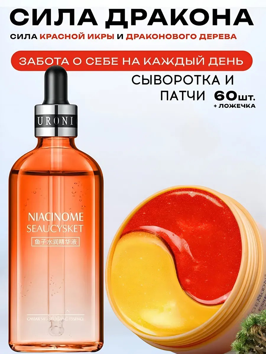Набор патчи с экстрактом икры и драконового дерева 60 штук и сывороткой с икрой 100 мл обеспечивают полноценный уход за кожей.Сочетание компонентов в наборе позволяет получить максимальный эффект. Средства с активной регенерирующей формулой эффективно «встраиваются» в клетки, активируют процессы восстановления и защищают от агрессивного действия факторов среды. В результате кожа становится подтянутой, гладкой и упругой.Аргирелин состоит из безопасных синтезированных полипептидов.Он эффективно разглаживает морщины, повышает упругость и эластичность кожи, способствует повышенной выработке коллагена и эластина. Средство оказывает выраженный лифтинг-эффект.Коллаген повышает упругость кожи, уменьшает глубину морщин и увлажняет глубокие слои эпидермиса.Икра является источником белков, именно поэтому она помогает бороться с увяданием кожи.Улучшает микроциркуляцию крови в клетках, усиливает обменные процессы в тканях, предотвращает потерю тонуса и разглаживает морщинки.Рекомендуется использовать набор в комплексе с другими средствами со схожим составом.Сыворотка улучшит впитывание активных компонентов, обеспечив более эффективный результат.