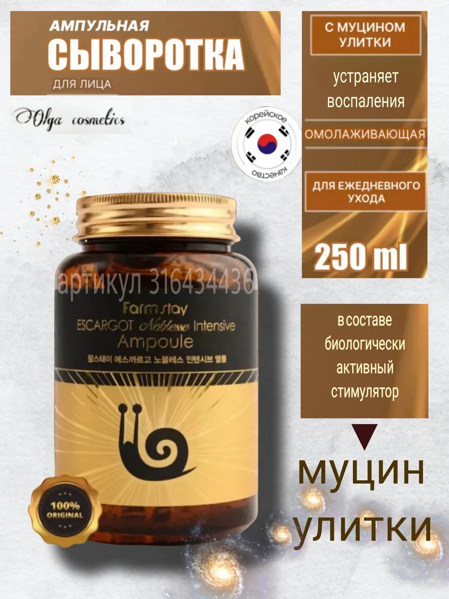 Многофункциональная ампульная сыворотка с муцином улитки Escargot Noblesse Intensive Ampoule Объём: 250 мл от корейского бренда FARMSTAY для глубокого восстановления и увлажнения кожи ускоряет процессы обновления и регенерации; устраняет красноту и воспаления; способствует разглаживанию морщин и повышает упругость кожи; увлажняет и восполняет недостаток влаги в клетках эпидермиса. Муцин улитки (2,500 мг) - биологически активный стимулятор, обогащенный ферментативным комплексом. Является мощным антиоксидантом, защищает клетки от разрушения и преждевременного увядания, выравнивает цвет лица и рассасывает застойные пятна.Ниацинамид способствует стимуляции синтеза коллагена и улучшению защитных функций кожи, помогает снизить трансэпидермальную потерю влаги из кожи и снизить пигментацию, смягчает, повышает эластичность кожи, увлажняет, сужает поры, успокаивает, эффективен при использовании для чувствительной кожи, улучшает микроциркуляцию крови, осветляет.