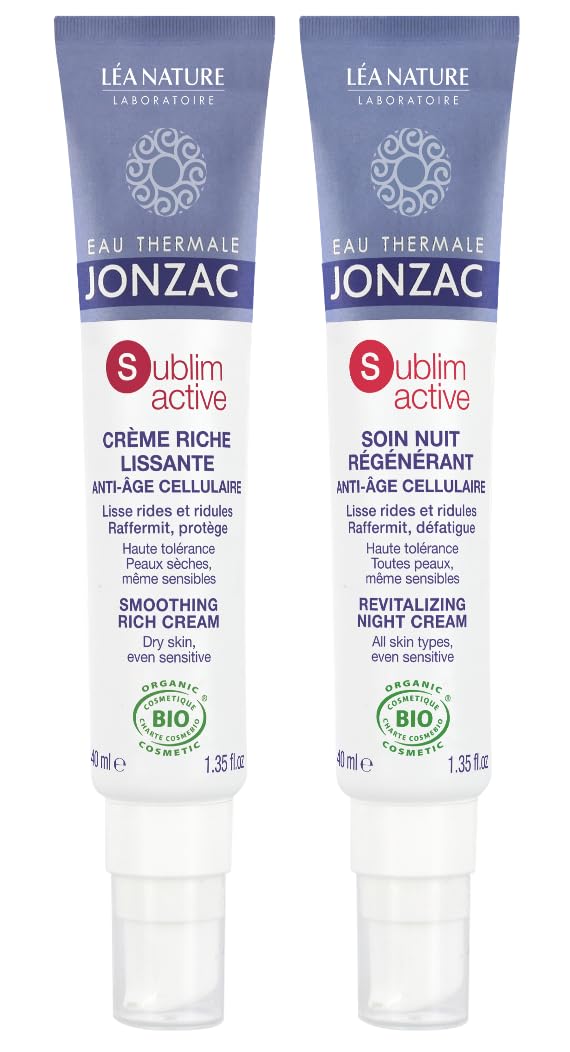 CONTENTS 1 x Sublimactive Anti-Aging Smoothing Rich Cream - 40ml Tube 1 x Sublimactive Anti-Aging Regenerating Night Cream - 40ml Tube. JONZAC THERMAL SPRING WATER: ORGANIC DERMO-COSMETICS Jonzac Thermal Spring Water skincare products are formulated to provide the best guarantees of dermo-cosmetic safety: they are composed of 99 naturally derived ingredients, certified organic. They are protected by 6 patent applications. They are made in France and are suitable for vegans. The tubes and bottles are eco-designed. DIRECTIONS FOR USE Smoothing Rich Cream: Apply morning and or evening to a perfectly cleansed face and neck. Excellent makeup base. Regenerating Night Cream: Apply the Cellular Anti-Aging Night Cream in the evening to a perfectly cleansed face and neck. RESULTS Rich Smoothing Cream: Thanks to its smooth, non-sticky texture, it smooths the skin. Wrinkles and fine lines are reduced, and the skin is firmed. Regenerating Night Cream: Thanks to its soft, creamy texture, it smooths wrinkles and fine lines. The skin is refreshed. ANTI-AGING FACIAL ROUTINE - SUBLIMACTIVE Rich Smoothing Cream: fights against skin aging. It nourishes and protects the skin. Regenerating Night Cream: firms the skin lastingly. Signs of aging are reduced night after night.