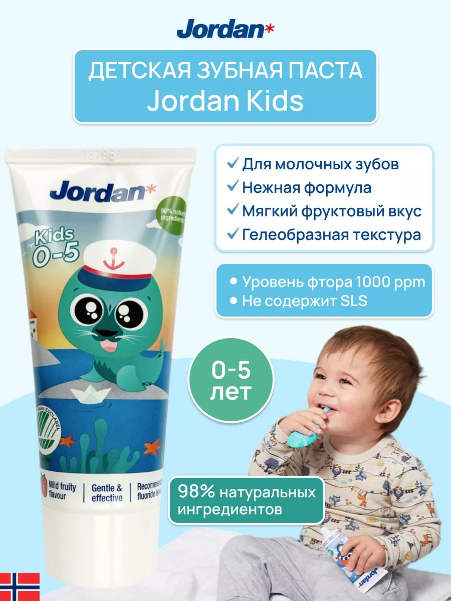 Первые зубки ребенка требуют особого ухода. Специалисты Jordan создали зубную пасту Kids для детей от 0-5 лет с рекомендованным уровнем фтора и 0% SLS. Зубная паста содержит мягкий пенообразователь, который деликатно воздействует на детские зубы. Его нежный фруктовый вкус очень нравится детям. Массовая доля фторида 1000 ppm. Для оптимальной чистки зубов используйте детскую зубную щетку Jordan с индикатором зубной пасты. Подходит для чувствительных зубов и десен. Вкус, любимый детьми. Эффект, любимый взрослыми.
