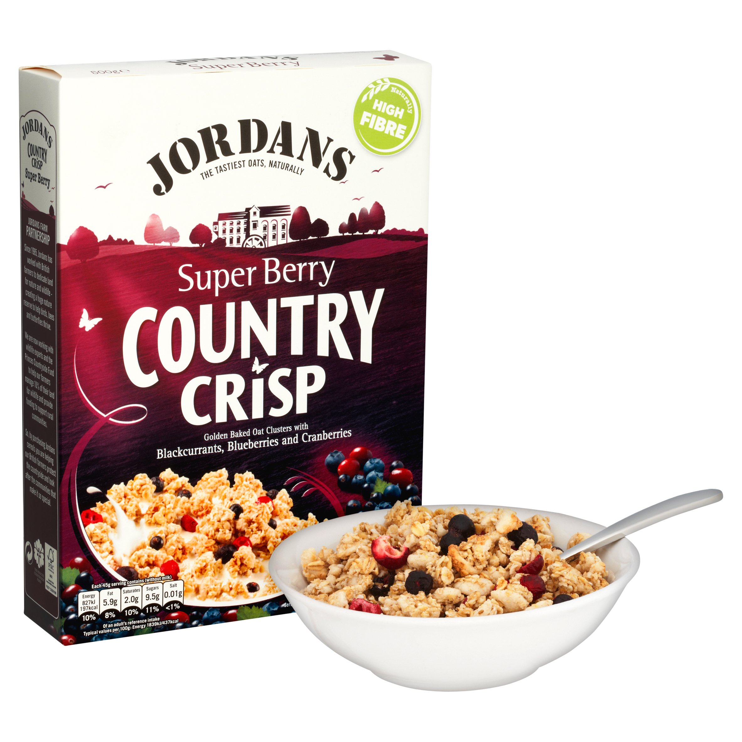 Crispy cereal clusters with freeze-dried berries. Jordans Country Super Berry Crisp: baked with British wholegrain oats and blended with blackcurrants, cranberries, and blueberries, Country Crisp clusters stay crunchy until the very last bite. It's a recipe that will have you coming back for more. Absolutely nothing artificial. Naturally high in fiber. No added salt. Contains non-GMO ingredients and certified sustainable palm oil. INGREDIENTS Whole grains (61 ) (oat flakes, barley flakes, oat flour), sugar, vegetable oils (rapeseed oil, palm oil), rice flour, desiccated coconut, freeze-dried berries (2.5 ) (blackcurrants, blueberries, cranberries), roasted chopped hazelnuts (0.5 ), natural flavoring INSTRUCTIONS Pour the cereal into a bowl and add milk or a suitable alternative. See moreJordans Country Crisp Super Berry 500 gDESCRIPTION DU PRODUIT DESCRIPTION DU PRODUIT Grappes de céréales croustillantes avec des baies lyophilisées. Jordans country super baie croustillante: cuit avec de l"avoine à grains entiers britanniques et mélangé avec des cassis, des canneberges et des myrtilles, les grappes Country Crisp restent croquantes jusqu"à la toute dernière bouchée. C'est une recette qui vous fera revenir pour plus. Absolument rien d'artificiel. Naturellement riche en fibres. Sans sel ajouté. Contient des ingrédients non GM et de l'huile de palme certifiée durable. INGRÉDIENTS Céréales complètes (61 ) flocons d'avoine, flocons d'orge, farine d'avoine), sucre, huiles végétales (huile de colza, huile de palme), farine de riz, noix de coco déshydratée, baies lyophilisées (2,5 ) (cassis, myrtilles, canneberges), noisettes hachées torréfiées (0,5 ), arôme naturel MODE D'EMPLOI Versez les céréales dans un bol et ajoutez du lait ou une alternative appropriée. Voir plus