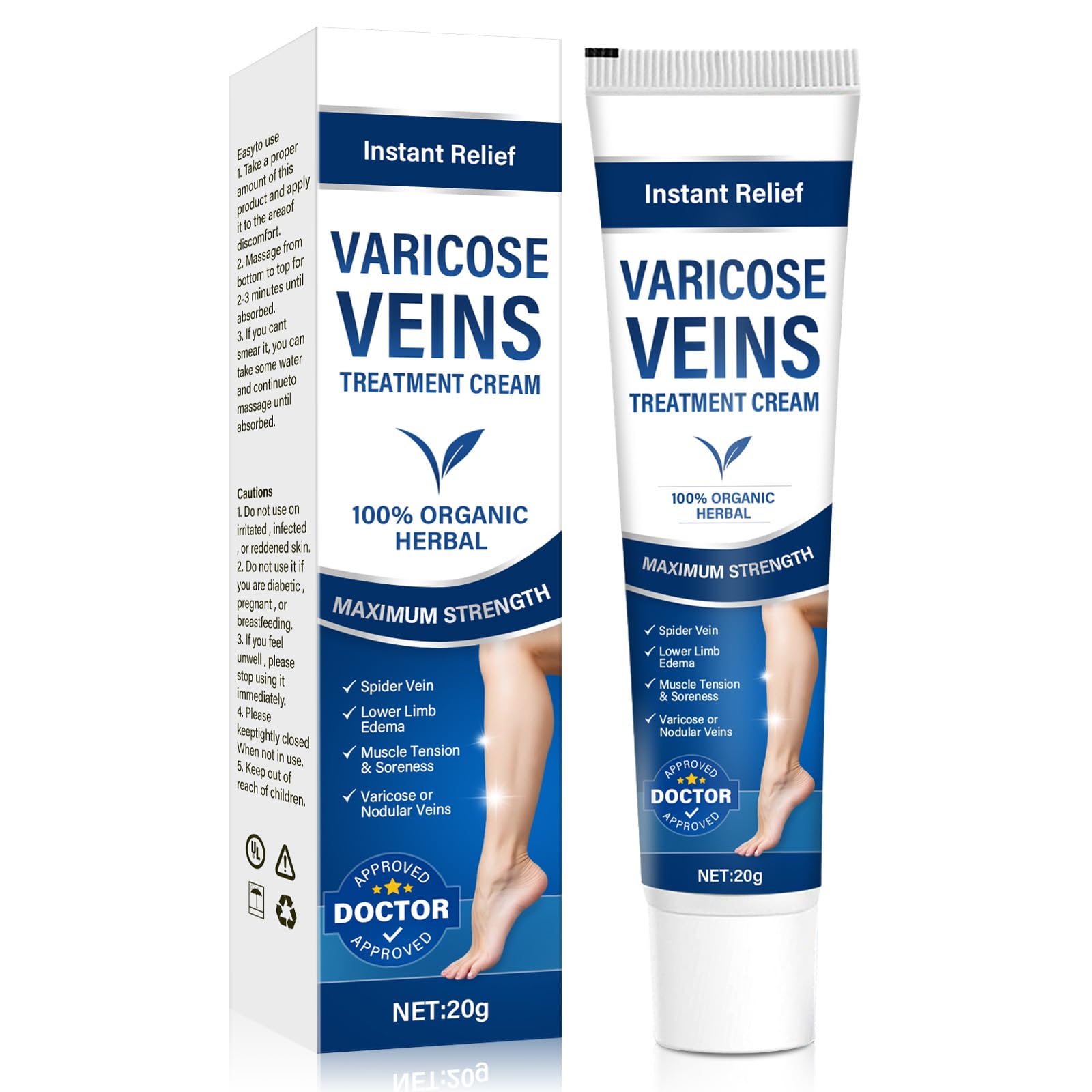 3 Main Benefits of Varicose Veins Treatment for Legs: Improves and eliminates varicose and spider veins Provides immediate relief for swollen and uncomfortable legs Deeply moisturizes, smoothes, and firms skin, and fights skin aging Features: Professional quality formula Safe and gentle ingredients It can be used for a wide range of leg conditions Suitable for all skin types How to use: Step 1: Cleanse and dry skin. Step 2: Apply an appropriate amount of varicose vein cream, spread evenly, and massage until completely absorbed. Step 3: Recommended to use 2-4 times a day. Warm tips: This product is for external use only If any discomfort occurs, please stop using it immediately. Specifications: Packaging includes: Varicose Veins Treatment for Legs Net: 20 g