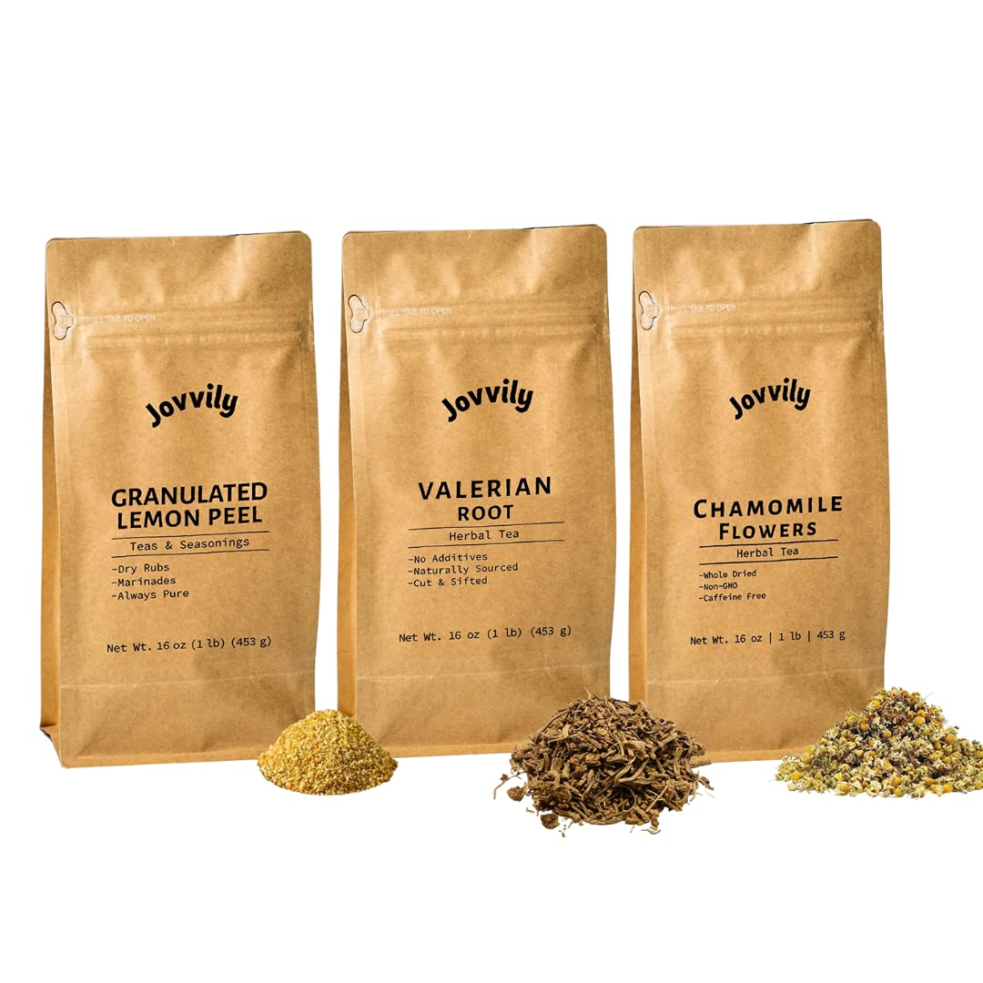 Jovvily Valerian Root Chamomile Flowers & Lemon Peel Bundle- 1lb - Cut & Sifted - Warm Teas - No Additives