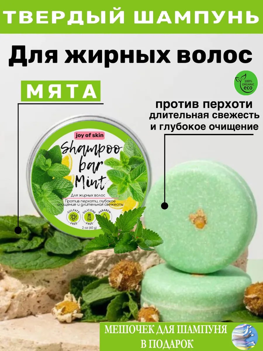Твердый шампунь для волос Мята от joy of skin тщательно очищает кожу головы и идеально подходит для жирных волос. Основной компонент - мята, которая придает волосам свежий, приятный аромат. Кроме того, в состав шампуня входят другие растительные экстракты, которые успокаивают волосяные луковицы и уменьшают поры на коже головы. Его можно брать с собой в дорогу или на тренировку, не опасаясь пролить жидкий шампунь. В состав шампуня Мята от joy of skin входят масло ши, ментол, эфирное масло лимона и масло виноградной косточки, что делает его идеальным средством для жирных и смешанных типов волос. Шампунь не содержит сульфатов и является гипоаллергенным, поэтому подходит для людей с чувствительной кожей головы.Твердый шампунь мыло "Мята" рекомендуется для жирных волос. Масло мяты, входящее в состав экономичного шампуня, борется с излишками жира на коже головы, делая волосы более свежими и чистыми. Оно дольше сохраняет свежесть волос, оставляя ощущение чистоты и прохлады. Твердый шампунь с мятой также является экологически чистым продуктом, что делает его идеальным для приверженцев экологичного образа жизни. Экотвердый шампунь смятой идеальный подарок к различным праздникам, включая дни рождения, Новый год, 8 марта, 23 февраля и День святого Валентина. Идеально подходит для мужчин, которые заботятся о своих волосах и любят экологически чистые продукты. Подарите своим волосам профессиональный уход, который дарит природа, с твердым шампунем для волос от joy of skin.