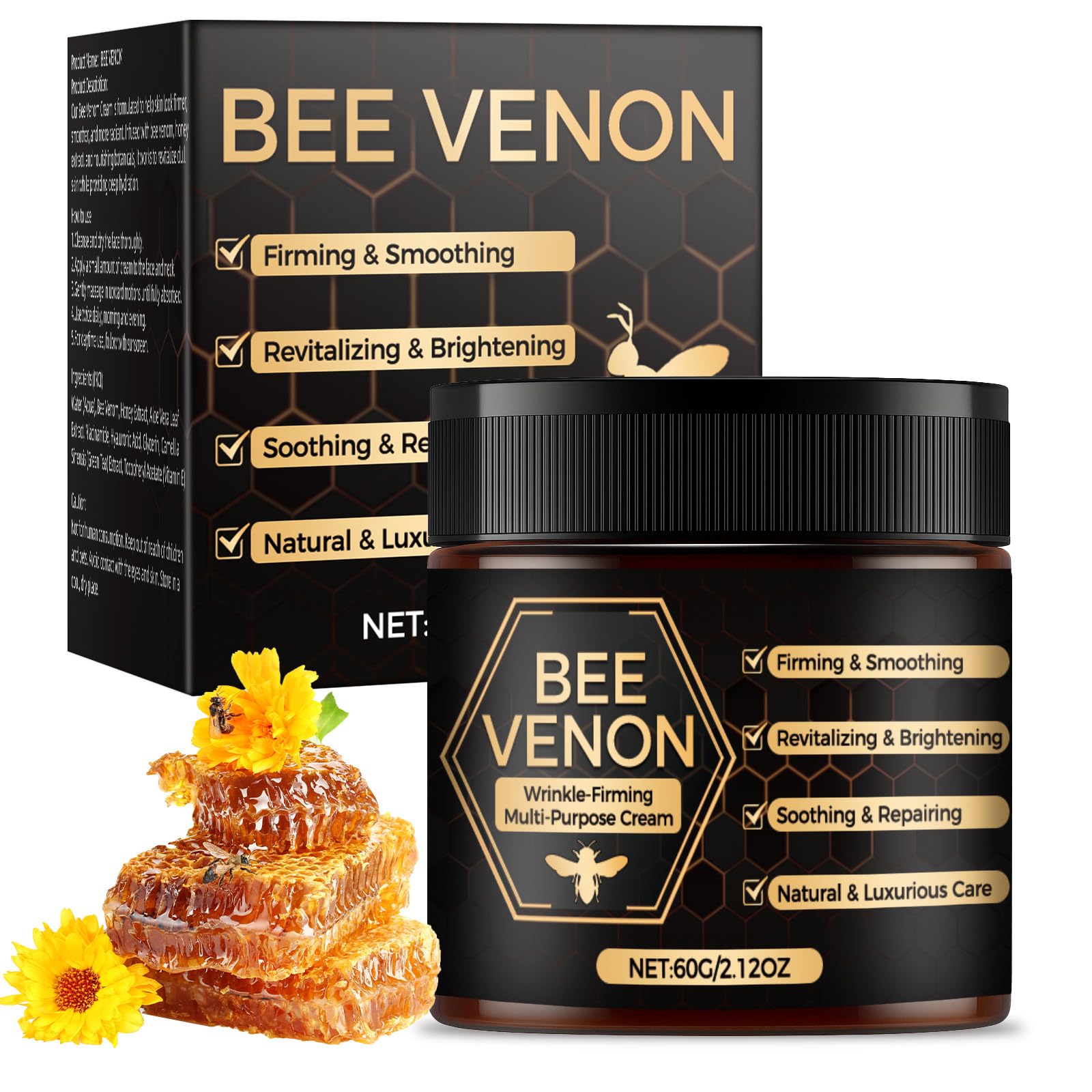 Visibly reduces wrinkles and fine lines SAFETY WARNING For external use only. Perform a patch test before first use. Do not use if you are allergic to bee stings or bee products (e.g. honey or propolis). Avoid contact with the eyes in case of contact, rinse thoroughly with water. Not suitable for children. Pregnant or breastfeeding women should consult a doctor before use. Discontinue use if irritation occurs. Store in a cool, dry place and protected from direct sunlight.Visibly reduces wrinkles and fine lines.Bienenvenom Anti-aging gezichtscrème, hydraterende en verstevigende verzorging met hyaluronzuur, rimpelcrème, 60 g Vermindert zichtbaar rimpels en fijne lijntjes VEILIGHEIDSWAARSCHUWING Alleen voor uitwendig gebruik. Voer voor het eerste gebruik een patchtest uit. Niet gebruiken als je allergisch bent voor bijensteken of bijenproducten (bijv. honing of propolis). Vermijd contact met de ogen bij contact grondig met water uitspoelen. Niet geschikt voor kinderen. Zwangere vrouwen of vrouwen die borstvoeding geven, moeten voor gebruik een arts raadplegen. Stop het gebruik als irritatie optreedt. Bewaren op een koele, droge plaats en beschermd tegen direct zonlicht.Vermindert zichtbaar rimpels en fijne lijntjes.