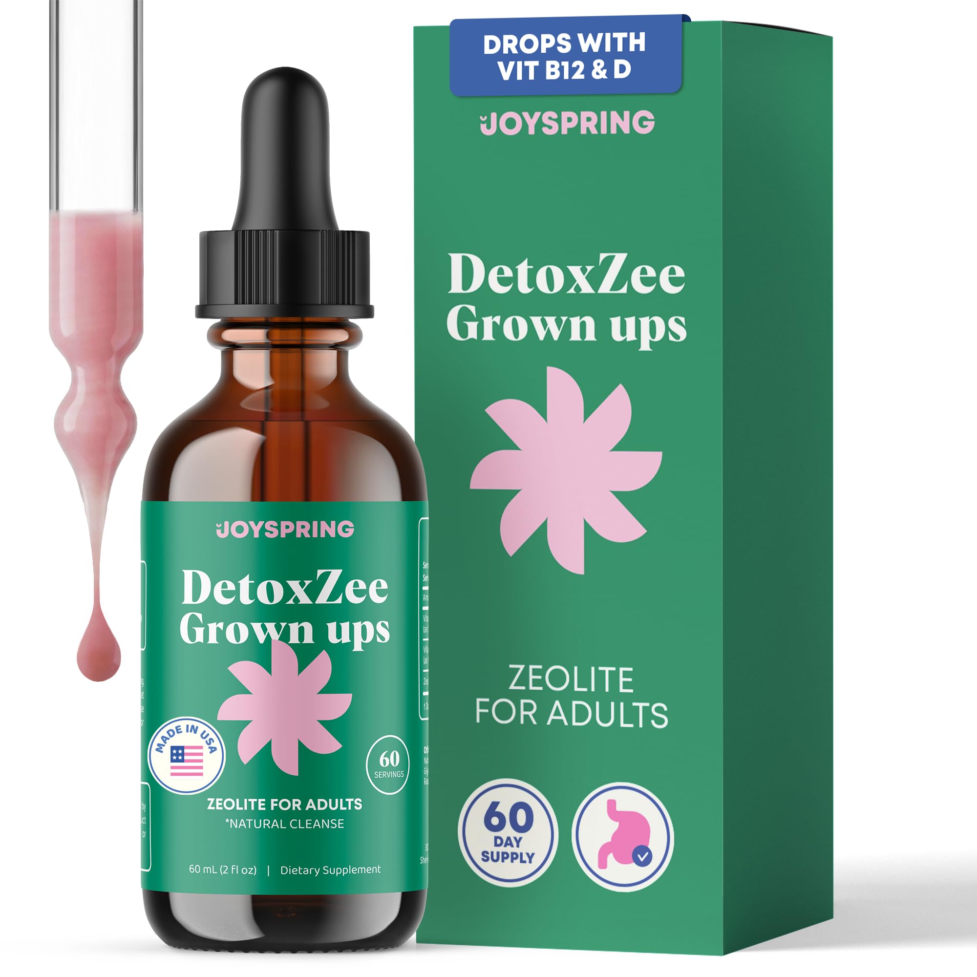 JoySpring DetoxZee Zeolite Drops for Adults Liquid Zeolite Clinoptilolite with Vitamin B12 & Vitamin D3 Sugar-Free Liquid B12 Drops for Energy & Mental Clarity | 18+ | 60-Day Supply | USA Made