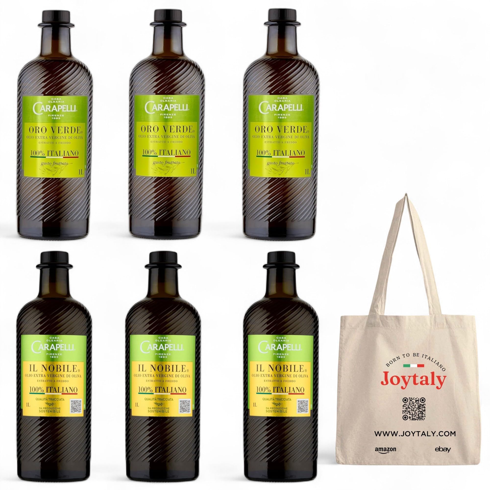 JOYTALY Carapelli Extra Virgin Olive Oil 6 x Extra Virgin Olive Oil 1 LT 3 x Il Nobile + 3 x Oro Verde 100% Italian (6000 ml Total) + Bag JOYTALY