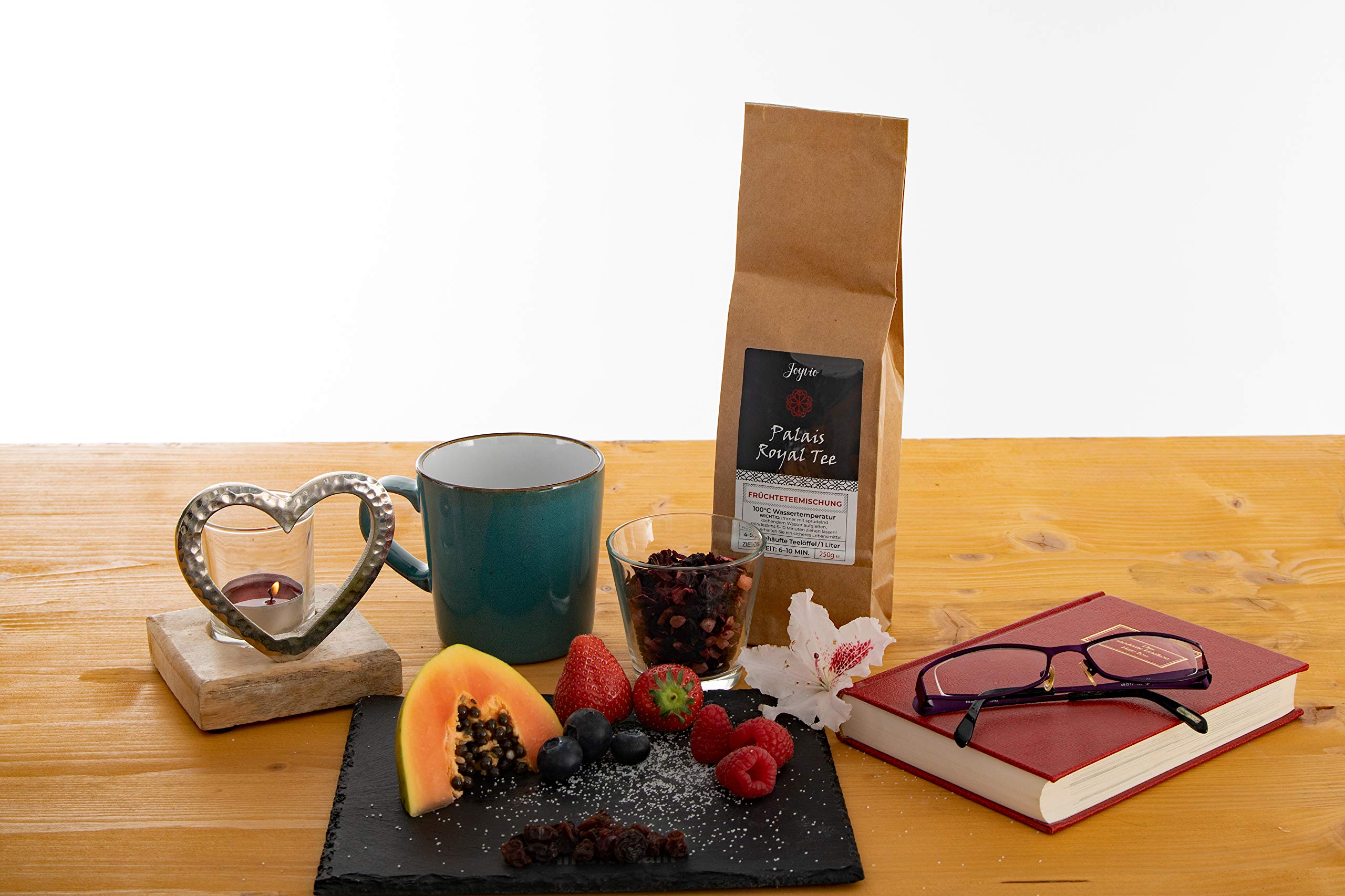 Fancy a royal treat? This fruit tea blend with sweet papaya, delicately tart hibiscus flowers, sweet currants, and various robust berries is a truly regal delight. Exotic, intense, and incredibly delicious. Ingredients: papaya cubes, hibiscus flowers, currants, blackcurrants, blueberries, lilac, flavorings, freeze-dried strawberries, and raspberries. This powerful red tea is especially recommended during pregnancy, as during this special time you should pay particular attention to ensuring your body's hydration needs are met. Palais Royal Fruit Tea Blend is not only suitable for pregnancy but also provides your body and your baby with essential minerals and vitamins. Not only is the sweet tropical fruit papaya, also known as the "health fruit," a veritable vitamin powerhouse with its high vitamin C content, but blackcurrants and blueberries are also rich in vitamins C, E, and A. In addition, they have high levels of iron, magnesium, and calcium. Lilac berries, the fruit of the elderberry plant, also provide potassium and anthocyanins. These are secondary plant compounds that, as natural antioxidants, are highly beneficial to the human body. Strawberries provide vitamins A and E, as well as many important B vitamins such as B3, B6, and B9. Finally, raspberries, which are aptly called "Pink Power," will provide you with vitamin C, iron, vitamin B9, calcium, and valuable antioxidants.Water temperature: 100 C. Quantity: 500g. Red fruit tea. No additives. Pure ingredients. Brewing time: 6-10 min. 4-5 stacked tablespoons per liter. 100 organic. Loose leaf tea for brewing.Envie d'un régal royal ? Ce mélange de thé aux fruits avec de la papaye sucrée, des fleurs d'hibiscus finement acidulées, des corinthes sucrées et diverses baies corsées est un plaisir royal. Exotique, intense et incroyablement bon goût. Ingrédients : cubes de papaye, fleurs d'hibiscus, corinthes, cassis, myrtilles, lilas, arômes, fraises lyophilisées et framboises. Le thé rouge à grand effet est particulièrement recommandé pendant la grossesse, car pendant cette période spéciale, vous devriez prêter une attention particulière à fournir suffisamment de besoins en hydratation de votre corps. Le mélange de thé aux fruits Palais Royal est non seulement adapté pour la grossesse, mais fournit également à votre corps et à votre enfant des minéraux et vitamines essentiels. Non seulement la papaye fruit tropical sucrée, également connue sous le nom de « fruit de la santé », est une véritable bombe vitaminée avec sa haute teneur en vitamine C. Les cassis et les myrtilles sont également riches en vitamines C, E et A. De plus, ils ont une teneur élevée en nutriments en fer, magnésium et calcium. Les baies de lilas, les fruits de la plante de sureau, fournissent également du potassium et des anthocyanes. Ce sont des substances végétales secondaires qui, en tant qu'antioxydants naturels, sont très précieuses pour le corps humain. Les fraises fournissent les vitamines A, E, ainsi que de nombreuses vitamines B importantes telles que les vitamines B3, B6 et B9. Enfin, les framboises, qui ne sont pas pour rien considérées comme « Pink Power », vous fourniront de la vitamine C, du fer, de la vitamine B9, du calcium et des antioxydants précieux.Température de l'eau : 100 C. Quantité : 500g. Thé aux fruits rouges. Aucun additif. Aliments purs. Temps de traction: 6-10 min. 4-5 cuillères à soupe empilées 1 litre. 100 biologique. Thé en vrac pour infuser.Joyvio Thé (Thé en vrac Palais Royal, 500 g)