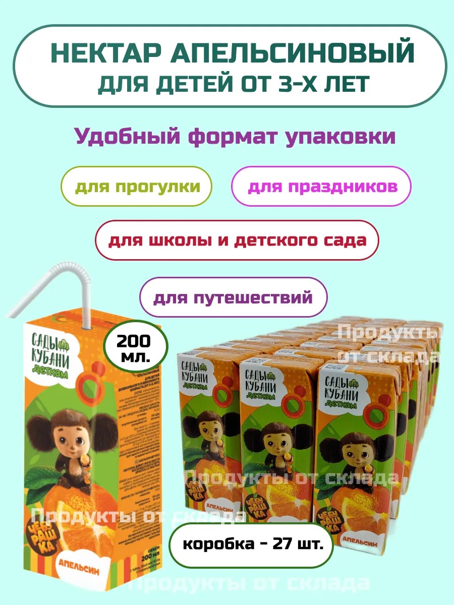 Апельсиновый сок «Сады Кубани» станет отличным выбором для утреннего завтрака, школьных перекусов или просто для освежения в жаркий летний день. Пусть ваш малыш насладится натуральным вкусом сочного апельсина, а вы будете уверены в качестве и полезности выбранного напитка. Упаковка с трубочкой объемом 200 мл. удобно брать с собой на прогулку, на дачу, в путешествие. Утолит жажду в жару и подарит пользу витаминов. 100% натуральный продукт. Для детского питания. Вкусный и полезный продукт. Яркая упаковка в любимым персонажем Чебой. Двухсторонний дизайн с игрой на упаковке позволит увлечь ребёнка в интересное и увлекательное путешествие вместе