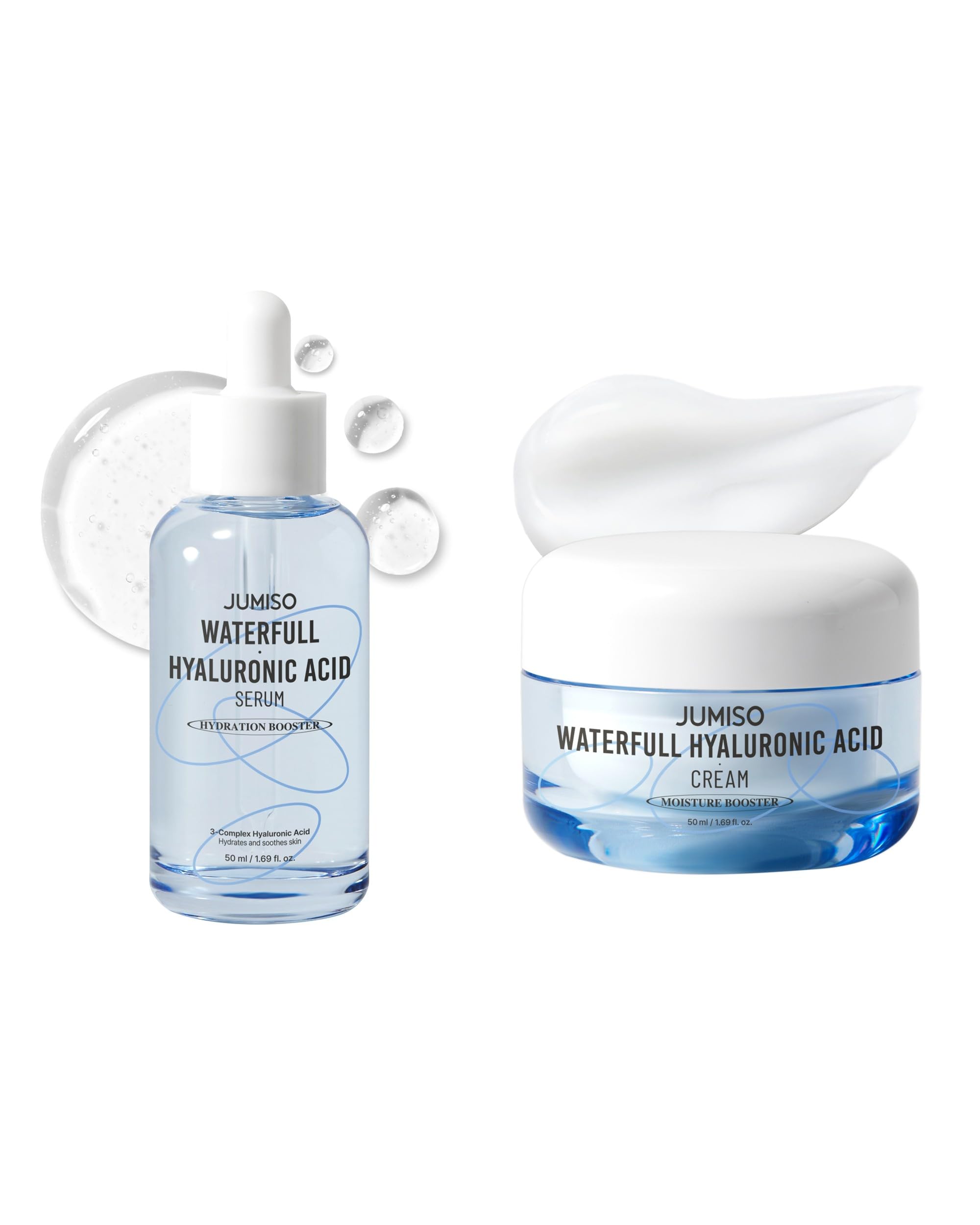 How to Use and Precautions Apply serum to cleansed skin, follow with cream as the final step. Suitable for daily morning and evening use. Features of Products and Ingredients Both products feature vegan and fragrance-free formulas, designed for comfortable use and easy application. Key Ingredients and Effects Includes ceramides, hyaluronic acid, and fermented components in a balanced formula to support daily skin care needs. Strengths Representing the Product Formulated with hyaluronic acid complexes and moisturizing ingredients, combined with a lightweight cream and serum for a refreshing skincare experience. Comprehensive Introduction JUMISO skincare bundle includes Waterfull Hyaluronic Acid Serum (1.69 fl.oz.) and Hyaluronic Cream (1.69 fl.oz.), designed for everyday skincare routines suitable for all skin types.