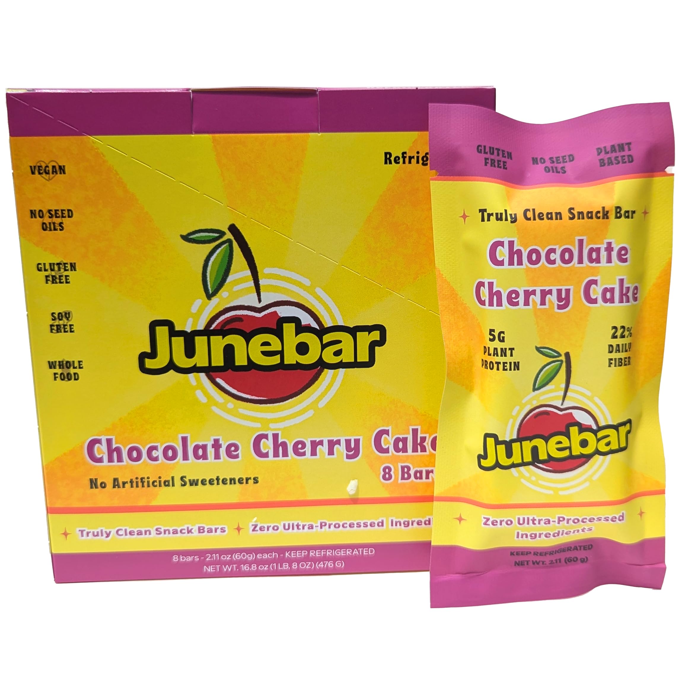 Junebars are truly clean snack bars made with all real food. No ultra-processed ingredients, no seed oils, gluten free, vegan, and super delicious! Whole food nutrition for health-caring people of all ages. Carton of 8 Chocolate Cherry Bars. Made in Rochester, NY, USA