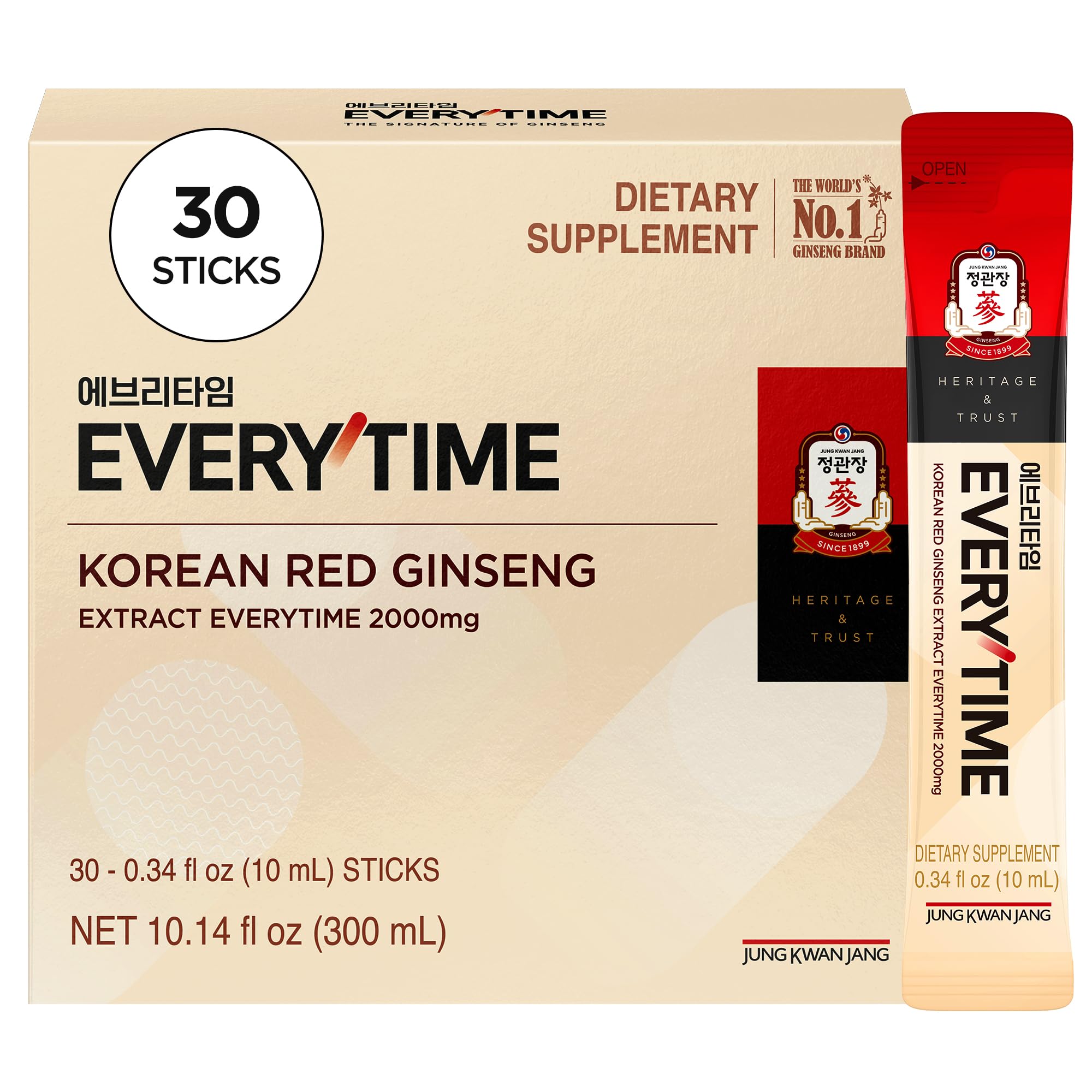 OVER A CENTURY OF TRUSTED EXPERTISE. With over 125 years of expertise, JungKwanJang upholds the highest standards from soil selection to production, earning trust across generations. Made from carefully chosen roots for potency and purity, this caffeine-free, vegan-friendly ginseng energy drink delivers the pure essence of Red Ginseng in every serving. SMOOTHER FLAVOR FAST ACTING. Mindfully crafted for a more enjoyable experience, this red ginseng supplement has a milder taste and absorbs more quickly than capsules or gummies—delivering results without the need for water. Ideal for those seeking a flavorful, functional addition to their routine, free from artificial stimulants. PORTABLE GREAT FOR PICK ME UP. Feeling drained? Get the boost without the crash with Everytime! Each compact red ginseng liquid stick fits effortlessly into your routine—whether you're at work, hitting the gym, or traveling. Each 0.34 fl oz (10ml) stick delivers a convenient 1-tablespoon serving—just one a day for an easy boost, where great taste meets function!. A WELL-BALANCED WELLNESS BLEND. Infused with the revitalizing power of 2,000mg Red Ginseng and Propolis, our Korean ginseng drink supports both body and mind while reinforcing immune function. Enhanced with Licorice and Ginger Extracts, it helps reduce fatigue, support circulation, sharpen memory, and contribute to overall well-being. PUREST FORM OF KOREAN RED GINSENG. Awaken your strength with the time-honored tradition of Korean ginseng supplement, mindfully cultivated and harvested to develop high concentrations of Ginsenosides. The treasured roots are steamed and dried to preserve its strength, supporting energy, endurance, and mental performance—a testament to centuries of craftsmanship!.
