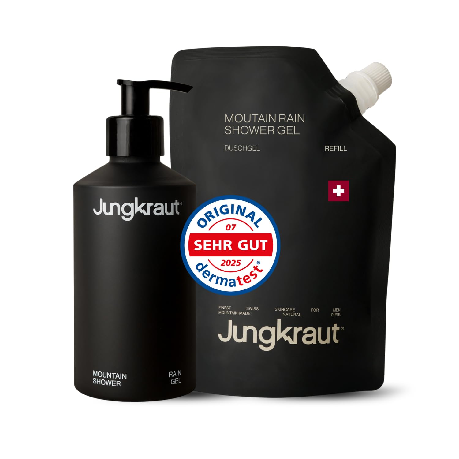 Our natural Jungkraut Shower Gel for men contains a lot of power. It cleanses your skin gently and pH neutrally and deeply refreshes it effectively. The two high-dose and coordinated active ingredients hydrate the skin for a long time and ensure the maintenance of the skin's natural moisture balance. The high-quality aluminum bottle can also be reused, avoiding unnecessary plastic waste. Suitable for all skin types, except extremely dry skin. SAFETY WARNING noneFragrance: In addition to fresh limes, lemons and bergamot, our signature scent in shower gel for men is also reminiscent of basil, alpine herbs, turmeric root and Virginia cedar. 100 natural fragrances, discreetly dosed. All skin types: specially developed for men's daily skin care. Cleanses and refreshes deeply effectively and pH neutral, maintains the natural moisture balance of the skin and is very mild for the skin. Suitable for all men's skin types, including sensitive skin. Unique quality: the Jungkraut shower gel for men is produced in the Swiss mountains according to the highest quality standards and effectiveness requirements. Uncompromising: 100 natural and pH-neutral formulation, without ingredients that are harmful to people and the environment. Pentavitin, amino complexes and three organically grown Swiss alpine herbs strengthen the skin barrier and protect against environmental influences. Pure Swiss natural cosmetics. First-class care: revitalizing shower gel for men for 24 hours of intensive moisture and daily mountain freshness. Intensively hydrates for healthy and well-groomed skin.Mountain Rain Shower Gel 300 ml fles 600 ml navulling, natuurlijke douchegel voor dagelijkse bergfrisheid, pH-neutraal, revitaliserend, hydraterend, mild, Zwitserse makelij In onze natuurlijke Jungkraut Shower Gel voor mannen zit veel kracht. Het reinigt je huid zacht en pH-neutraal en verfrist deze diep effectief. De twee hooggedoseerde en afgestemde werkzame stoffen hydrateren de huid langdurig en zorgen voor het behoud van de natuurlijke vochtbalans van de huid. De hoogwaardige aluminium fles kan bovendien worden hergebruikt, waardoor onnodig plastic afval kan worden vermeden. Geschikt voor alle huidtypes, behalve voor extreem droge huid. VEILIGHEIDSWAARSCHUWING geenGeur: onze kenmerkende geur in douchegel voor mannen doet naast verse limoenen, citroenen en bergamot ook denken aan basilicum, alpenkruiden, kurkumawortel en Virginia-ceder. 100 natuurlijke geurstoffen, discreet gedoseerd. Alle huidtypes: speciaal ontwikkeld voor de dagelijkse huidverzorging van mannen. Reinigt en verfrist diep effectief en pH-neutraal, behoudt de natuurlijke vochtbalans van de huid en is zeer mild voor de huid. Geschikt voor alle mannenhuidtypes, ook voor de gevoelige huid. Unieke kwaliteit: de Jungkraut douchegel voor mannen wordt in de Zwitserse bergen volgens de hoogste kwaliteitsnormen en effectiviteitseisen geproduceerd. Compromisloos: 100 natuurlijke en pH-neutrale formulering, zonder ingrediënten die schadelijk zijn voor mens en milieu. Pentavitine, aminocomplexen en drie biologisch geteelde Zwitserse alpenkruiden versterken de huidbarrière en beschermen tegen milieu-invloeden. Zuiver Zwitserse natuurlijke cosmetica. Eersteklas verzorging: revitaliserende douchegel voor mannen voor 24 uur intensieve vochtigheid en dagelijkse bergfrisheid. Hydrateert intensief voor een gezonde en verzorgde huid.