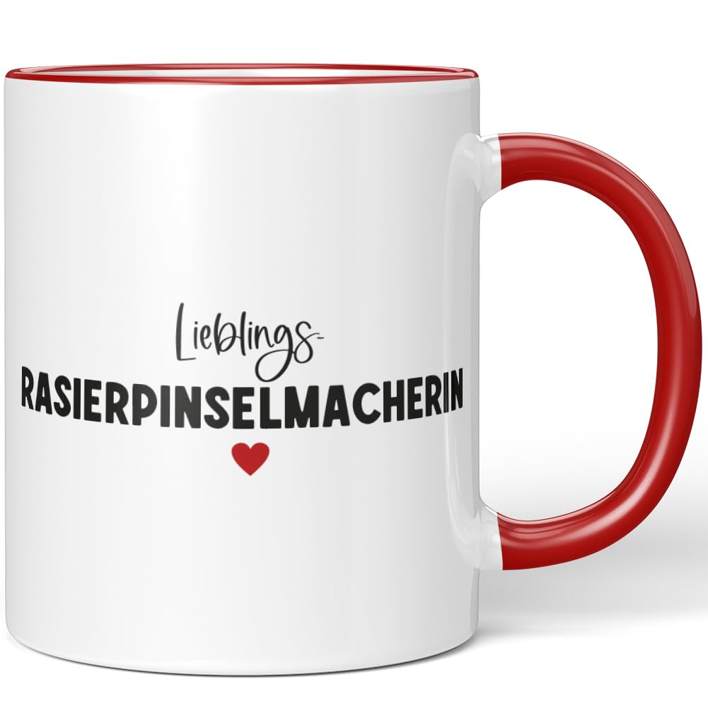 Lieferumfang: 1x JUNIWORDS Tasse mit dem Schriftzug ""Lieblings-Rasierpinselmacherin"" in Rot. Made in Germany! Abmessungen der Tasse: Fassungsvermögen ca. 330 ml, Höhe ca. 95 mm, Durchmesser ca. 82 mm. Langlebige Qualität. Spülmaschinengeeignet nach BS EN 12875-4 und mikrowellenbeständig nach BS EN 15284:2007. Beidseitig bedruckte Keramiktasse mit farbigen Henkel Trinkrand. Wählen Sie aus tollen Farben Ihre Wunschfarbe. JUNIWORDS Tasse mit Motiv Spruch: Lieblings-Rasierpinselmacherin.