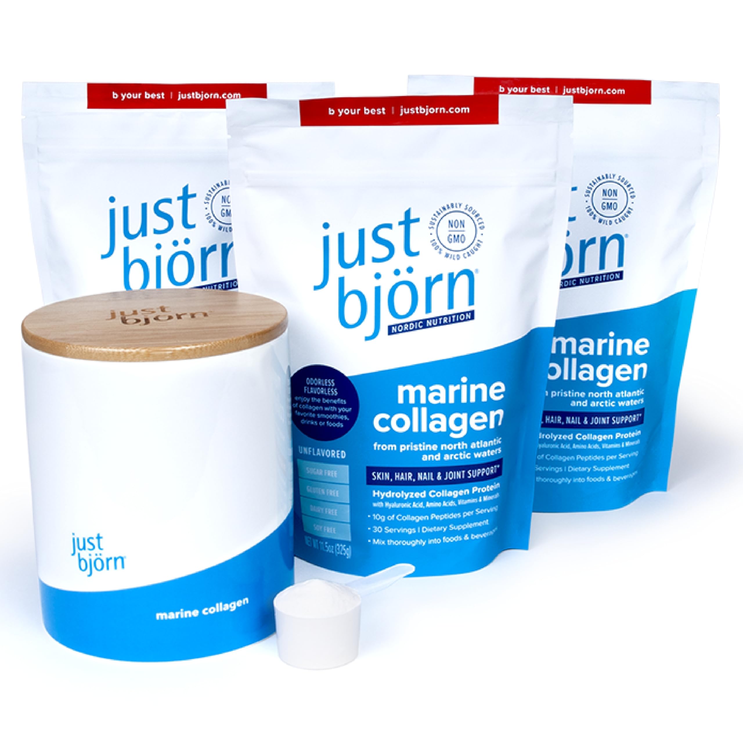 Just Bjorn Marine Collagen Peptides Starter Kit - Collagen Powder for Women & Men - Skin Hair Nail & Joint Support - Hyaluronic Acid Vitamin C Amino Acids - Unflavored (90 Servings)