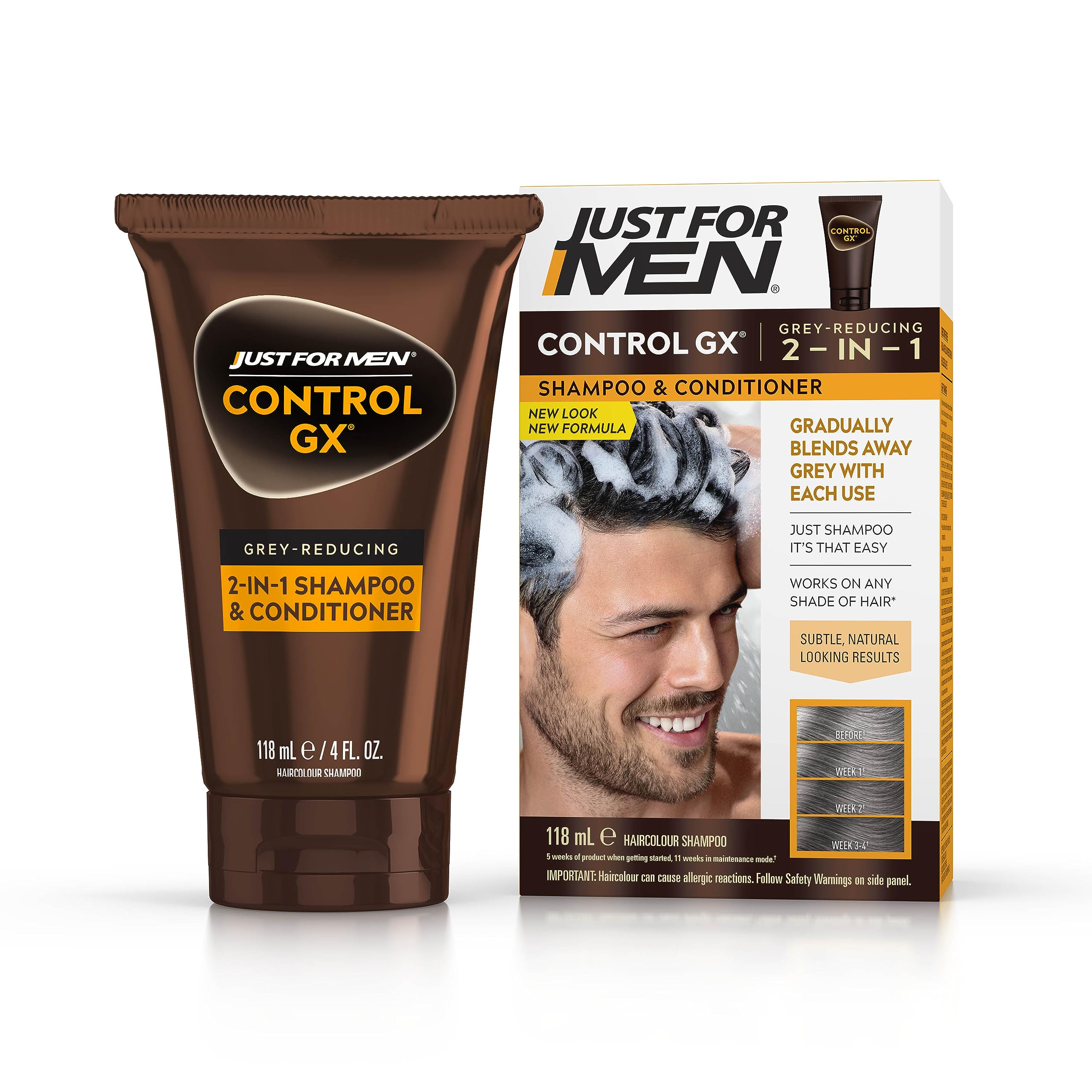 Controlgx Gray Reducer 2 in 1 Shampoo and Conditioner 118 ml INGREDIENTS Ingredients: Aqua, Disodium Lauryl Sulfosuccinate, Decyl Glucoside, Cetearyl Alcohol, Glycol Stearate, Cocamidopropyl Hydroxysultaine, Dimethicone, Guar Hydroxypropyltrimonium Chloride, Sodium Cocoyl Isethionate, N,N-Bis(2-Hydroxyethyl)-p-Phenylenediamine Sulfate, Cocos Nucifera (coconut). ) Oil, Aloe Barbados. ensis Leaf Extract, Ethanolamine, Dihydroxyindoline HBr, Cetearyl Glucoside, Erythorbic Acid, Sodium Sulfite, Stearamide AMP, m-Aminophenol, Caprylyl Glycol, p-Aminophenol, Panthenol, Laureth-23, Laureth-4, Maltodextrin, Etidronic Acid, Phenoxyethanol, Sorbic Acid, Parfum, Limonene, Linalool. DIRECTIONS FOR USE 1. Apply CGX Innovative Shampoo and Conditioner to wet hair. 2. Lather and gently massage the scalp. 3. Leave on for 3 to 5 minutes. 4. Rinse thoroughly. For best results, use it regularly. 5. For gradual reduction of gray hair, use it in place of your regular shampoo and conditioner until you like what you see. Then alternate with your usual shampoo to maintain the look you love. Simply use it in place of your regular shampoo and conditioner until you like what you see. Then, alternate with your regular shampoo to maintain the look you love. Makes gray reduction easy: just wash your hair. Triple-patented formula keeps hair stronger and healthier. This product works best for all hair shades. Gradually reduces gray hair, for subtle, natural-looking results, unlike other men's hair colors. Ammonia and peroxide free. The innovative CGX shampoo and conditioner gradually reduces gray with every wash. Gently and thoroughly cleanses and conditions, increg volume for a thicker, fuller look. Controlgx Grey Réducteur 2 en 1 Shampooing et après-shampoing 118 ml INGRÉDIENTS Ingrédients : Aqua, Disodium Lauryl Sulfosuccinate, Decyl Glucoside, Cetearyl Alcohol, Glycol Stearate, Cocamidopropyl Hydroxysultaine, Dimethicone, Guar Hydroxypropyltrimonium Chloride, Sodium Cocoyl Isethionate, N,N-Bis(2-Hydroxyethyl)-p-Phenylenediamine Sulfate, Cocos Nucifera (noix de coco). ) Huile, Aloe Barbade. ensis Leaf Extract, Ethanolamine, Dihydroxyindoline HBr, Cetearyl Glucoside, Erythorbic Acid, Sodium Sulfite, Stearamide AMP, m-Aminophénol, Caprylyl Glycol, p-Aminophénol, Panthénol, Laureth-23, Laureth-4, Maltodextrine, Etidronic Acid, Phenoxyethanol, Sorbic Acid, Parfum, limonène, Linalool. MODE D'EMPLOI 1. Appliquez le shampooing et après-shampooing innovant CGX sur cheveux mouillés. 2. Faites mousser et massez délicatement le cuir chevelu. 3. Laissez agir pendant 3 à 5 minutes. 4. Rincez abondamment. Pour de meilleurs résultats, utilisez-le régulièrement. 5. Pour une réduction progressive des cheveux gris, utilisez-le à la place de votre shampooing et revitalisant habituels jusqu'à ce que vous aimiez ce que vous voyez. Alternez ensuite avec votre shampooing habituel pour conserver le look que vous aimez. Il suffit de l'utiliser à la place de votre shampooing et après-shampoing habituels jusqu'à ce que vous aimiez ce que vous voyez. Ensuite, alternez avec votre shampooing ordinaire pour maintenir le look que vous aimez. Facilite la réduction des cheveux gris : il suffit de laver vos cheveux. Formule triple brevetée, garde les cheveux plus forts et plus sains. Ce produit fonctionne mieux pour toutes les nuances de cheveux. Réduit progressivement les cheveux gris, pour des résultats subtils et naturels, contrairement à d'autres colorations pour hommes. Sans ammoniaque ni peroxyde. Le shampooing et après-shampoing CGX innovant réduit progressivement le gris à chaque lavage. Nettoie et revitalise en douceur et en profondeur, augmentant le volume pour un look plus épais et plus volumineux.