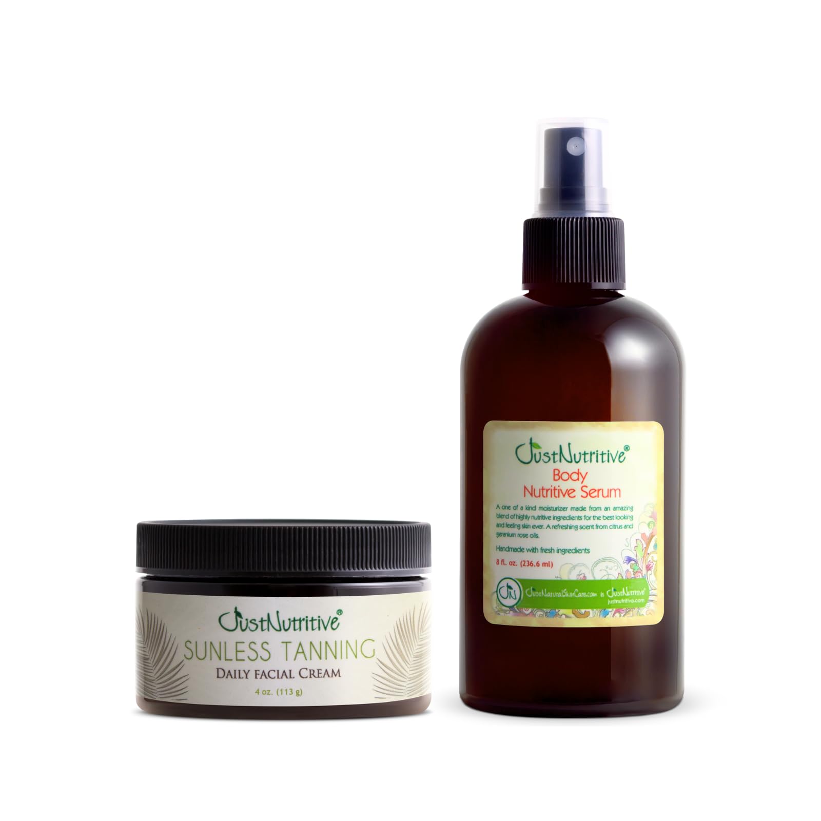 Glow head to toe with this radiant 2-piece bundle from Just Nutritive. Our Sunless Tanning Daily Facial Cream delivers a streak-free, buildable glow while deeply hydrating the skin with nourishing oils like apricot, borage, and chia seed. Specifically formulated for the face and neck, it provides long-lasting moisture and a natural bronze finish with zero sun exposure. Pair it with the Body Nutritive Serum, a lightweight body oil enriched with Kukui, Hazelnut, and Vitamin E to hydrate and smooth dry skin, enhance your body tan, and leave a luminous finish. This plant-based serum absorbs quickly and boosts skin's elasticity, making it the perfect match for your daily sunless tanning routine. Together, they offer a complete self-tanning system powered by nature—gentle, effective, and made with love in the USA. Vegan, cruelty-free, and free from synthetic additives—because you deserve a glow that's pure and nourishing.VEGAN, CRUELTY-FREE HANDMADE IN THE USA Both products are handcrafted in the USA with Earth's purest ingredients. No parabens, dyes, or animal testing—just clean beauty that works. Together, let's nourish with nature. GENTLE, NON-TOXIC, AND SUITABLE FOR ALL SKIN TYPES Made with plant-based ingredients and zero synthetic additives, this duo is safe for sensitive skin and delivers a clean, radiant glow without blotches, orange tones, or chemical smells. NOURISH EXTEND YOUR GLOW WITH BODY SERUM Our Body Nutritive Serum enhances your tan while deeply hydrating dry, flaky skin. With Vitamin E and natural oils like Kukui and Hazelnut, it smooths, softens, and improves skin texture over time. DAILY FACIAL TANNER WITH DEEP HYDRATION Formulated for delicate facial skin, this self-tanning face cream gives you a sunkissed, streak-free glow while moisturizing and softening with Apricot, Chia Seed, and Borage Seed Oils. COMPLETE FACE BODY SELF-TANNING SYSTEM Get a radiant, natural-looking tan from head to toe—without sun exposure. This bundle combines our Sunless Tanning Daily Facial Cream and Body Nutritive Serum for a flawless, buildable bronze glow.