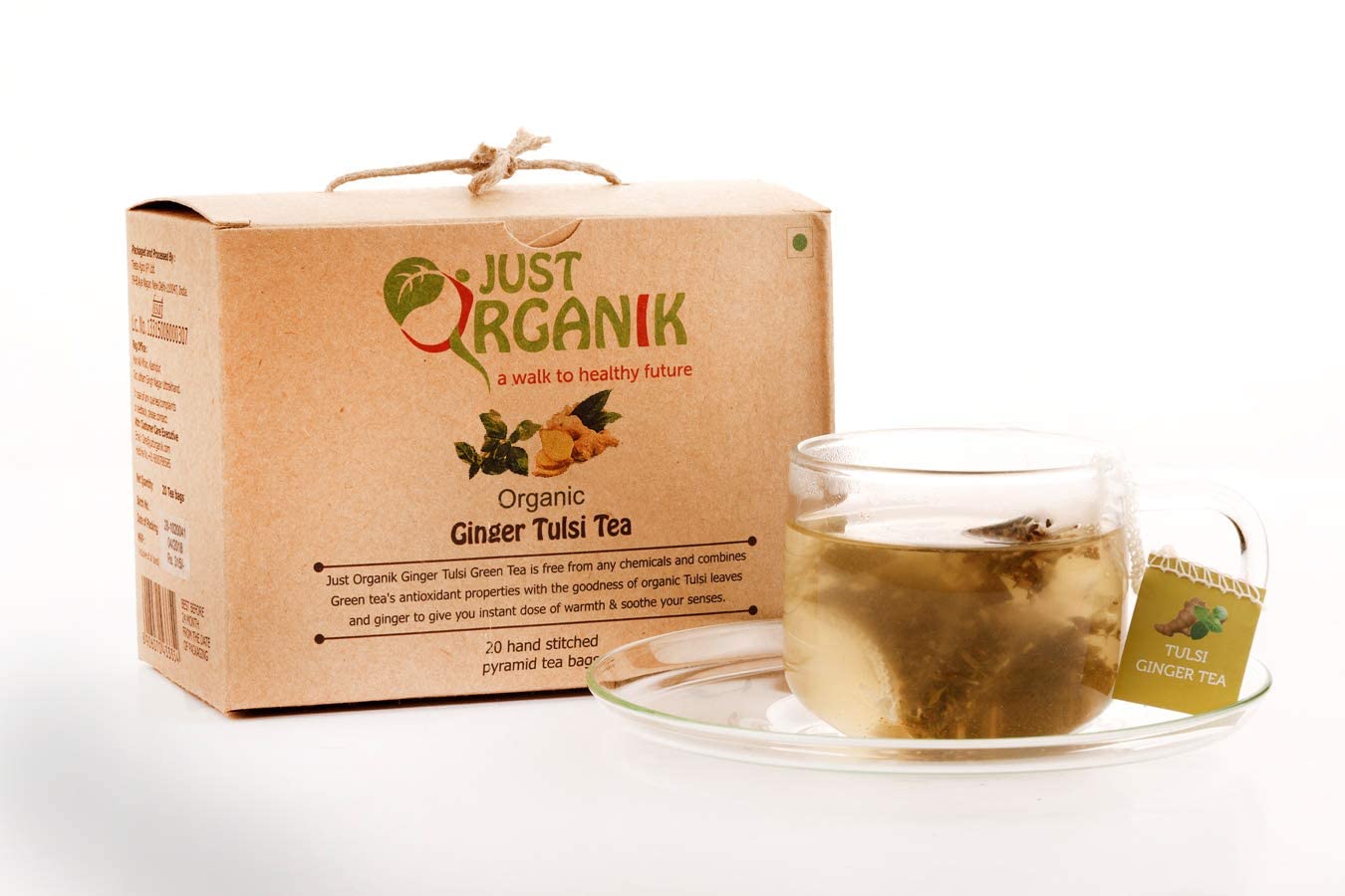 Shelf Life: 720 Days Ingredient Type: Vegetarian Total Weight: 400 gm (each .020 gm) Package Contents: 20Product of India. 1 Tea bag (2 gm) can serve 2-3 cups depending on individual taste. Contains Green Tea, Tulsi (Holy Basil). Aroma and Flavor of Tulsi Green Tea helps you relax recharges your senses. 100 ORGANIC, NO GMO, NO CHEMICALS, NO PESTICIDE.Shelf Life: 720 Days Ingredient Type: Vegetarian Total Weight: 400 gm (each .020 gm) Package Contents: 20Product of India. 1 Tea bag (2 gm) can serve 2-3 cups depending on individual taste. Contains Green Tea, Tulsi (Holy Basil). Aroma and Flavor of Tulsi Green Tea helps you relax recharges your senses. 100 ORGANIC, NO GMO, NO CHEMICALS, NO PESTICIDE.Just Organik Ginger Tulsi Tea - 20 Hand Stitched Pyramid Tea Bags, 100 Organic