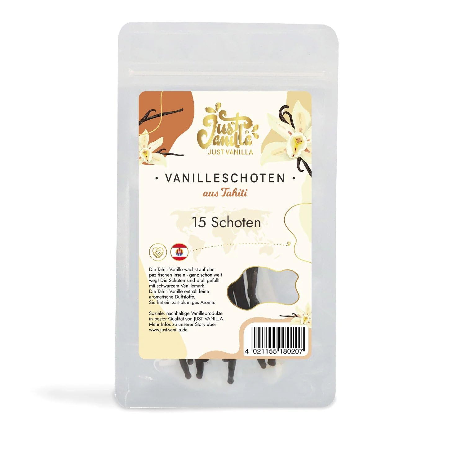 JUST VANILLA Vanilleschoten 15 ganze Stück 32 Gramm Premium Tahiti Vanille Stangen zum Backen, Kochen, Extrahieren, Verfeinern von Süßspeisen 15er