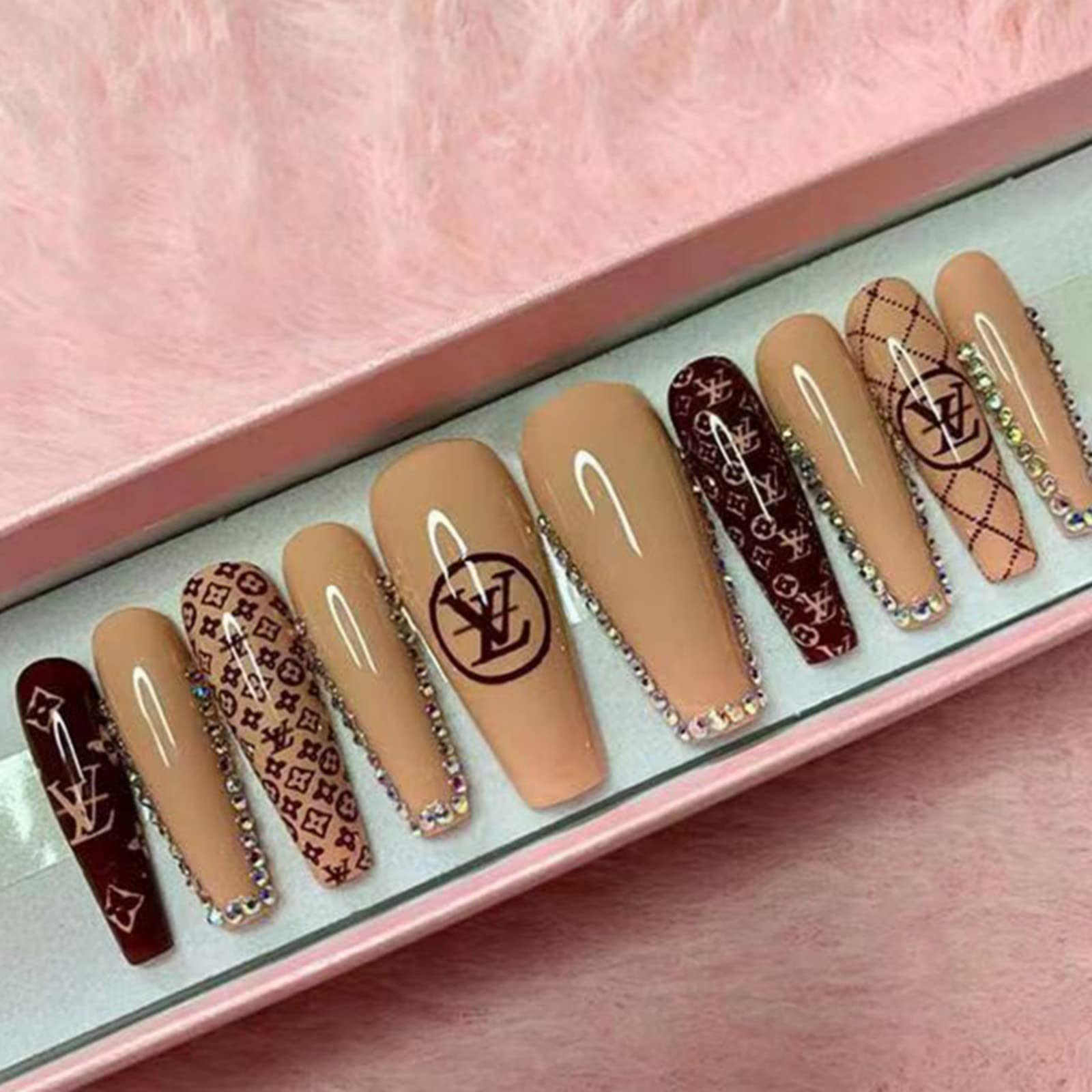 JUSTOTRY Nail Art Our wish: Love yourself, love nail art, DIY your own nail art. 24 PCS Press on Nails Package include: - 24 pcs in 1 pack - 10 sizes(0-9 on back) - 1 nail glue Shape: Coffin Type: Long Length Style: brown jewels1 How to applySTEP1:Trim the sides and cuticle area for an accurate fit. STEP2: Select the correct size of fake nails for each finger. STEP3: Apply nail glue to you nails surface. STEP4: Put on the fake nails,Keep pressing for 10 seconds. STEP5:File and shape your new nails if needed. How to remove1.Soften the glue: Soak your nails in warm water for 10-15 mins. 2.Tear off: Gently peel pre-glued nails off from side. Tips: v1.Before use please clean your death nail skin. v2.Avoid soaking your hands in water for a long time. v3.Please allow little size error due to manual measurement. Customer Guarantee: We offer return or refund if it broken. Any questions, please feel free to contact us and we'll reply soon. Heartfelt thanks to everyone who chooses our nail art products!