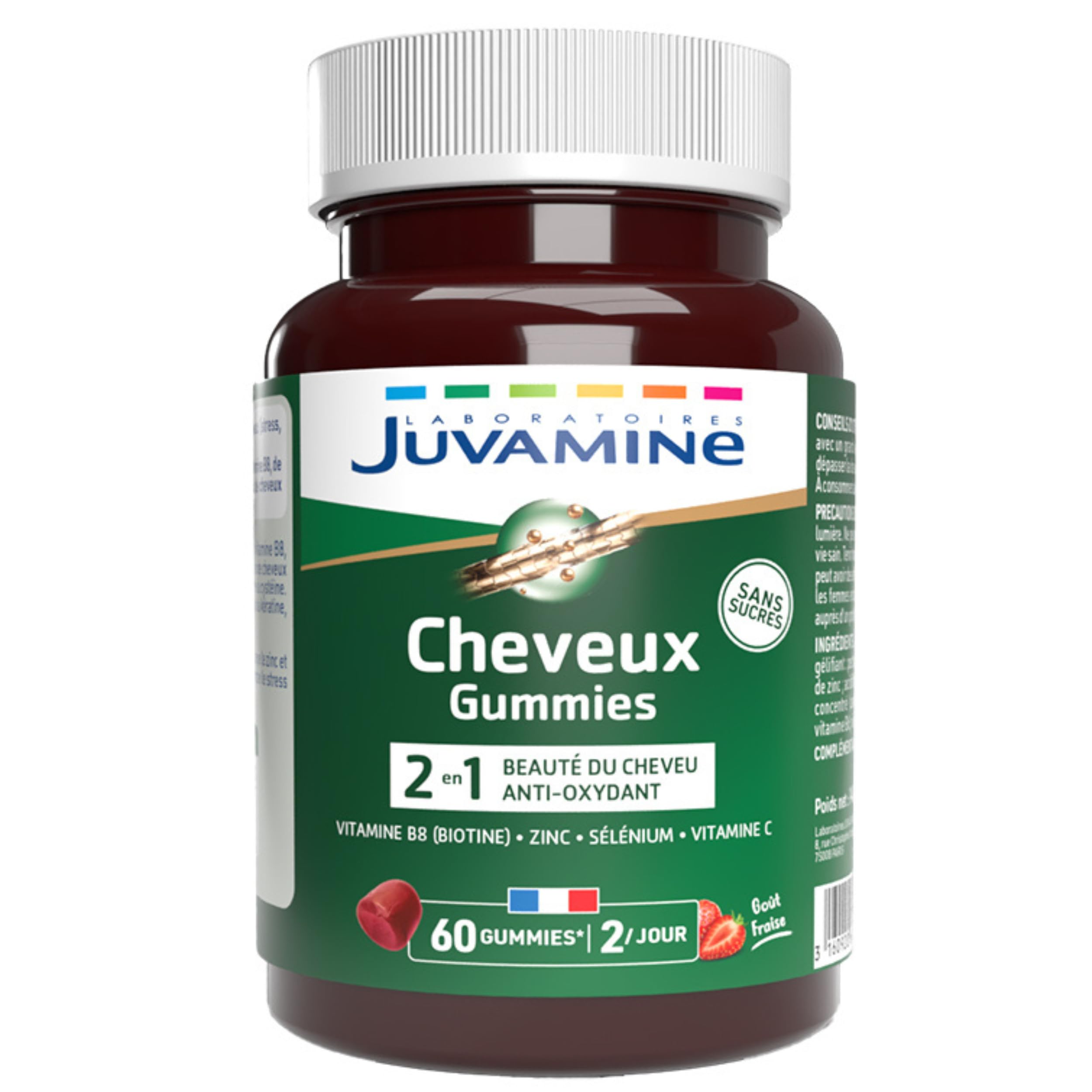 : In our daily lives, stress, seasonal changes, and diet are just some of the factors that can weaken hair. Juvamine Laboratories' 2-in-1 Hair Gummies are formulated with vitamins and minerals known for their beneficial effects on hair. Juvamine Laboratories' 2-in-1 Hair Gummies, a hair beauty and antioxidant supplement, support your hair care routine. This formula combines selenium, vitamin B8 (biotin), and zinc, which contribute to the maintenance of normal hair. Vitamin B6 helps with the normal synthesis of cysteine, an amino acid naturally present in keratin, a protein that makes up hair. Selenium, zinc, and vitamin C, also in the formula, help protect cells against oxidative stress. Directions for use: Take 2 gummies daily with a meal and a large glass of water. 30-day program, renewable. Do not exceed the recommended daily dose. Contains 60 gummies . Consume within 2 months of opening. gummies gummies. Precautions for use: This product is not a substitute for a varied and balanced diet and a healthy lifestyle. Do not exceed the recommended daily dose. Keep out of reach of young children. Excessive consumption may have laxative effects. Not recommended for children under 12 years of age. Pregnant or breastfeeding women should consult a healthcare professional before taking any supplements. Made in France according to particularly high standards. Suitable for vegetarians, vegans, and those following a plant-based diet. Ingredients: bulking agent: maltitol acid: citric acid gelling agent: pectin natural strawberry flavor vitamin C mineral: zinc citrate acid: sodium citrates mineral: sodium selenite concentrate (carrot and blackcurrant) glazing agent: carnauba wax Vitamin B6 Vitamin B8. ALL OPINIONS AND COMMENTS RELATING TO THE PRODUCTS ARE THE SOLE RESPONSIBILITY OF THEIR AUTHORS AND ARE IN NO WAY ENDORSED OR APPROVED BY THE MANUFACTURER. JUVAMINE EXPERTISE From formulation to finished product, Laboratoires Juvamine products benefit from the expertise of food supplement specialists for over 35 years. They are designed to help you regain your well-being, thanks to natural active ingredients with recognized benefits. This product is made in France. It cannot replace a varied and balanced diet and a healthy lifestyle. Do not exceed the recommended daily dose. Keep out of reach of young children. Manufacturers may occasionally change the composition of their products and or their labeling. The actual product labeling may contain additional and or different information than that shown on our website. Always read the information, warnings, and instructions for use on the label or packaging before using or consuming a product. All opinions and comments regarding products are the sole responsibility of their authors and are in no way endorsed or approved by the Manufacturer. Ingredients: Bulking agent: maltitol acid: citric acid gelling agent: pectin natural strawberry flavor vitamin C mineral: zinc citrate acid: sodium citrates mineral: sodium selenite concentrate (carrot and blackcurrant) glazing agent: carnauba wax vitamin B6 vitamin B8. FOOD SUPPLEMENT BASED ON VITAMINS AND MINERALS. P.when('A').execute(function(A) { A.on('a:expander:toggle_description:toggle:collapse', function(data) { window.scroll(0, data.expander. expander[0].offsetTop-100) }) }) Directions for use: Take 2 gummies daily with a meal and a large glass of water. 30-day program, renewable. Do not exceed the recommended daily dose. Contains 60 gummies . Consume within 2 months of opening. Safety Warning: Store in a cool, dry place away from light. This product is not a substitute for a varied and balanced diet and a healthy lifestyle. Do not exceed the recommended daily dose. Keep out of reach of young children. Excessive consumption may have laxative effects. Not recommended for children under 12 years of age. Pregnant or breastfeeding women are advised to consult a healthcare professional before taking any supplements. See moreMADE IN FRANCE - Juvamine Laboratories' 2-in-1 Hair Gummies food supplement is made in France. EXPERTISE AND QUALITY - Juvamine Laboratories boasts over 35 years of expertise and collaborative research between food industry specialists, pharmacists, and quality engineers who select and combine essential micronutrients for daily life. ANTIOXIDANT: Selenium, zinc, and vitamin C help protect cells against oxidative stress. HEALTHY AND BEAUTIFUL HAIR: Selenium, vitamin B8 (biotin), and zinc contribute to the maintenance of normal hair. Vitamin B6 helps with the normal synthesis of cysteine ??(an amino acid naturally present in keratin, a protein component of hair). WHY? Stress, seasonal changes, diet. All these factors can weaken hair. Rich in vitamins and minerals, the 2-in-1 Hair Gummies accompany you in your hair care routine.Description du produit Dans notre quotidien, le stress, les changements de saison, l'alimentation, sont divers facteurs qui peuvent fragiliser les cheveux. Les Gummies Cheveux 2-en-1, des Laboratoires Juvamine ont été élaborés à base de vitamines et minéraux reconnus pour leurs vertus sur les cheveux. GUMMIES CHEVEUX 2-en-1, beauté du cheveu et anti-oxydant, des Laboratoires Juvamine, vous accompagne dans votre routine capillaire. Cette formule combine du sélénium, de la vitamine B8 (biotine) et du zinc, qui contribuent au maintien de cheveux normaux. La vitamine B6 aide à la synthèse normale de la cystéine. Cette dernière est un acide aminé naturellement présent dans la kératine, une protéine qui compose le cheveu. Le sélénium, le zinc et la vitamine C, présents dans la formule, contribuent à protéger les cellules contre le stress oxydatif. Conseils d'utilisation : Prendre 2 gummies par jour au cours d'un repas avec un grand verre d'eau. Programme de 30 jours, renouvelable. Ne pas dépasser la dose journalière recommandée. Contient 60 gummies . A consommer dans les 2 mois après ouverture. gummies gommes Précautions d'emploi : Ne peut remplacer une ali