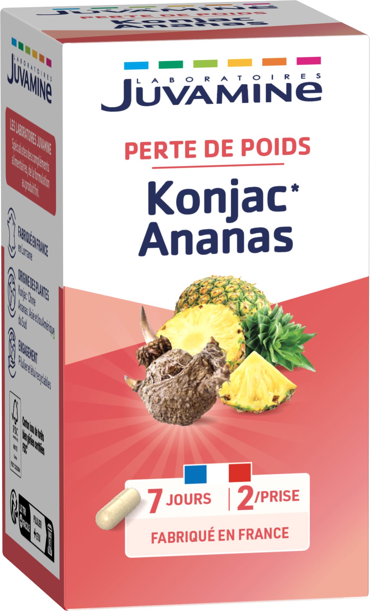Food supplement from Juvamine Laboratories based on konjac and pineapple which contributes to weight loss thanks to glucomannan, an active ingredient contained in konjac. Konjac is an ally in any slimming program. From formulation to finished product, Laboratoires Juvamine products benefit from the expertise of food supplement specialists for over 30 years. They are designed to help you regain your well-being, thanks to natural active ingredients with recognized virtues. DIRECTIONS FOR USE: Take 2 capsules 3 times a day before each meal with a large glass of water (at least 250 ml), for one week, renewable. Contains 42 capsules. PRECAUTIONS FOR USE: Plant-based food supplement. Food supplements cannot replace a varied, balanced diet and a healthy lifestyle. Do not exceed the indicated daily doses. Keep out of reach of young children. Store in a cool, dry place. To avoid any risk of suffocation and or obstruction of the throat or esophagus, it is imperative to consume it with plenty of water to ensure ingestion as far as the stomach. Risk of suffocation in the event of difficulty swallowing or in the event of ingestion with an inadequate liquid. Do not open the capsules or take them in powder form. INGREDIENTS: Konjac: 76 halal-certified gelatin of bovine origin concentrated Pineapple juice powder: 8.6 anti-caking agent: magnesium salts of fatty acids. ORIGIN OF PLANTS: Konjac: China Pineapple: Asia and or South America COMPOSITION: For 6 capsules Konjac (Rhizome) --- 3432 mg including Glucomannan -- 3000mg Pineapple -------- 1209mg The beneficial effect is obtained by the daily consumption of 3000 mg of Konjac glucomannan in 3 doses of 1000 mg, i.e. 2 capsules, taken with 1 or 2 glasses of water, before meals and as part of a low-calorie diet. In juice equivalent Manufacturers may occasionally modify the composition of their product and or their labeling. Actual product labeling may contain more and or different information than that shown on our site. Always read the information, warnings and conditions of use on the label or packaging before using or consuming a product. ANY OPINIONS AND COMMENTS RELATING TO THE PRODUCTS ARE THE SOLE RESPONSIBILITY OF THEIR AUTHORS, THEY ARE IN NO WAY ENDORSED OR ENDORSED BY THE MANUFACTURER INGREDIENTS Konjac: 76 halal-certified gelatin of bovine origin concentrated Pineapple juice powder: 8.6 anti-caking agent: magnesium salts of fatty acids.Package weight: 0.28 kilograms. 1-WEEK SLIMMING PROGRAM: Take 2 capsules 3 times a day before each meal with a large glass of water (at least 250 ml), for one renewable week. Contains 42 capsules. FRENCH MANUFACTURE: The Konjac-Pineapple food supplement from Juvamine Laboratories is manufactured in our factory in Forbach, Lorraine. PLANT-BASED: Juvamine Laboratories have formulated the Juvamine Konjac Pineapple product from plants and fruits. WEIGHT LOSS: Konjac glucomannan contributes to weight loss as part of a low-calorie diet. Complément alimentaire des Laboratoires Juvamine à base de konjac et d'ananas qui contribue à la perte de poids grâce au glucomannane, actif contenu dans le konjac. Le konjac est un allié de tout programme minceur. De la formulation au produit fini, les produits Laboratoires Juvamine bénéficient de l'expertise des spécialistes des compléments alimentaires depuis plus de 30 ans. Ils sont conçus pour vous aider à retrouver votre bien-être, grâce à des actifs naturels aux vertus reconnues. CONSEILS D'UTILISATION : Prendre 2 gélules 3 fois par jour avant chaque repas avec un grand verre d'eau (au moins 250 ml), pendant une semaine renouvelable. Contient 42 gélules. PRECAUTIONS D'EMPLOI : Complément alimentaire à base de plantes. Les compléments alimentaires ne peuvent remplacer une alimentation variée, équilibrée et un mode de vie sain. Ne pas dépasser les doses journalières indiquées. Tenir hors de portée des jeunes enfants. A conserver dans un endroit frais et sec. Afin d'éviter tout risque de suffocation et ou d'obstruction de la gorge ou de l'œsophage, il est impératif de le consommer avec beaucoup d'eau pour garantir une ingestion jusqu'à l'estomac. Risque de suffocation en cas de difficulté de déglutition ou en cas de d'ingestion avec un liquide inadéquat. Ne pas ouvrir les gélules et ne pas les prendre sous forme de poudre. INGREDIENTS : Konjac : 76 gélatine d'origine bovine certifiée halal poudre de jus concentré d'Ananas : 8,6 antiagglomérant : sels de magnésium d'acides gras. ORIGINE DES PLANTES : Konjac : Chine Ananas : Asie et ou Amérique du Sud COMPOSITION : Pour 6 gélules Konjac (Rhizome) --- 3432 mg dont Glucomannane -- 3000mg Ananas -------- 1209mg L'effet bénéfique est obtenu par la consommation journalière de 3000 mg de glucomannane de Konjac en 3 doses de 1000 mg, soit 2 gélules, prises avec 1 ou 2 verres d'eau, avant les repas et dans le cadre d'un régime hypocalorique. En équivalent jus Les fabricants peuvent occasionnellement modifier la composition de leur produit et ou leurs étiquetages. L'étiquetage réel des produits peut contenir des informations supplémentaires et ou différentes de celles figurant sur notre site. Veillez à toujours prendre connaissance des informations, avertissements et conditions d'utilisation figurant sur l'étiquette ou l'emballage avant d'utiliser un produit ou de le consommerTOUT AVIS ET COMMENTAIRES RELATIFS AUX PRODUITS SONT DE LA RESPONSABILITÉ UNIQUE DE LEURS AUTEURS, ILS NE SONT EN AUCUN CAS CAUTIONNÉS OU APPROUVÉS PAR LE FABRICANT INGRÉDIENTS Konjac : 76 gélatine d'origine bovine certifiée halal poudre de jus concentré d'Ananas : 8,6 antiagglomérant : sels de magnésium d'acides gras.Poids du colis: 0.28 kilogrammes. PROGRAMME MINCEUR 1 SEMAINE : Prendre 2 gélules 3 fois par jour avant chaque repas avec un grand verre d'eau (au moins 250 ml), pendant une semaine renouvelable Contient 42 gélules. FABRICATION FRANCAISE : Le complément alimentaire Konjac-Ananas des Laboratoir