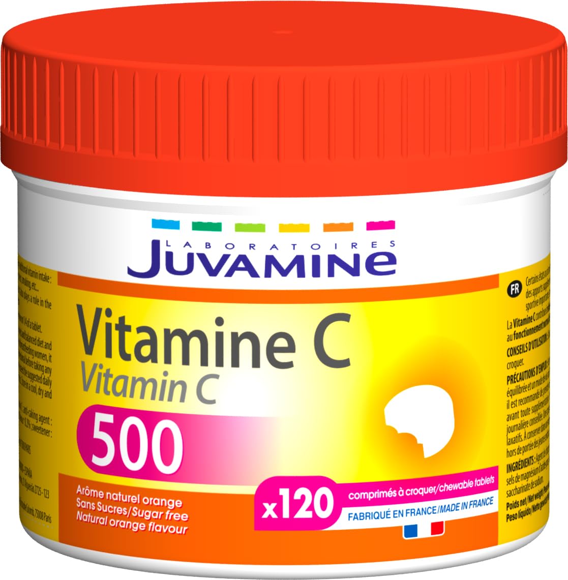 : In certain life circumstances, the body may need an additional intake of vitamins due to a particular condition or environment: pregnancy, intense physical activity, stress, smoking, etc. Support your body in case of temporary fatigue with Juvamine Laboratories' chewable Vitamin C 500. For those wishing for an additional intake of vitamin C during difficult periods (fatigue, overwork, winter, etc.). Food supplement based on vitamin C, with sweetener. Directions for use: Every morning, take 1 4 of a scored tablet to suck or chew. 4-month program, to be repeated if necessary. This provides you with 156 of the Reference Intake each day. Reference Intake for a typical adult (8400kJ 2000kcal). Precautions for use: Food supplement based on vitamins and sweeteners. Food supplements cannot replace a varied, balanced diet and a healthy lifestyle. Do not exceed the stated daily doses. Keep out of reach of young children. store in a cool, dry place. Excessive consumption may have a laxative effect. Manufacturers may occasionally change the composition of their products and or their labeling. Actual product labeling may contain additional and or different information than that shown on our website. Always read the information, warnings, and directions for use on the label or packaging before using or consuming a product. ALL PRODUCT REVIEWS AND COMMENTS RELATING TO THE PRODUCTS ARE THE SOLE RESPONSIBILITY OF THEIR AUTHORS AND ARE IN NO WAY ENDORSED OR APPROVED BY THE MANUFACTURER. Ingredients: Bulking agent: Sorbitol Vitamin C Anti-caking agent: Magnesium salts of fatty acids Natural orange flavoring: 0.2 Sweetener: Sodium Saccharin. Nutritional values Composition per 1 4 tablet: Vitamin C: 125 mg or 156 RI Reference intake for an average adult (8400kJ 2000kcal) P.when('A').execute(function(A) { A.on('a:expander:toggle_description:toggle:collapse', function(data) { window.scroll(0, data.expander. expander[0].offsetTop-100) }) }) Directions for use: Every morning, suck or chew 1 4 of a tablet. Safety Warning: This product is not a substitute for a varied and balanced diet and a healthy lifestyle. Pregnant or breastfeeding women should consult a healthcare professional before taking any supplements. It is recommended to adhere to the recommended daily dose. Excessive consumption may have a laxative effect. store in a cool, dry place away from light. Keep out of reach of young children. See moreMANUFACTURING: Made in France. CONVENIENT SIZE: Maxi jar of 120 Vitamin C 500 tablets. FRENCH COMPANY: Juvamine Laboratories' Vitamin C 500 is produced in France, in Forbach. BOOST YOUR IMMUNE SYSTEM: Vitamin C helps reduce fatigue and supports the normal function of the immune system. FIGHT TEMPORARY FATIGUE: For those seeking an additional source of vitamin C during challenging periods (intense fatigue, overwork, winter, etc.).Description du produit Dans certaines circonstances de la vie, l'organisme peut avoir besoin d'un apport supplémentaire en vitamines, dû à un état ou environnement particulier: grossesse, activité sportive importante, situation de stress, tabac.Aider votre organisme en cas de fatigue passagère avec la vitamine C 500 à croquer des laboratoires Juvamine. Pour les personnes souhaitant un apport en vitamine C supplémentaire au cours de périodes difficiles (fatigue, surmenage, hiver.)Complément alimentaire à base de vitamine C, avec édulcorant.Conseils d'utilisation: chaque matin, prendre 1 4 de comprimé sécable à sucer ou à croquer. Programme de 4 mois, à renouveler si nécessaire.Cela vous apporte chaque jour vous apporte 156 des apports de Référence apports de Référence pour un adulte type (8400kJ 2000kcal)précautions d'emploi: complément alimentaire à base de vitamines et édulcorants.Les compléments alimentaires ne peuvent remplacer une alimentation variée, équilibrée et un mode de vie sain. Ne pas dépasser les doses journalières indiquées. Tenir hors de portée des jeunes enfants. A conserver dans un endroit frais et sec. Une consommation excessive peut avoir des effets laxatifs.Les fabricants peuvent occasionnellement modifier la composition de leur produit et ou leurs étiquetages. L'étiquetage réel des produits peut contenir des informations supplémentaires et ou différentes de celles figurant sur notre site. Veillez à toujours prendre connaissance des informations, avertissements et conditions d'utilisation figurant sur l'étiquette ou l'emballage avant d'utiliser un produit ou de le consommer TOUT AVIS ET COMMENTAIRES RELATIFS AUX PRODUITS SONT DE LA RESPONSABILITÉ UNIQUE DE LEURS AUTEURS, ILS NE SONT EN AUCUN CAS CAUTIONNÉS OU APPROUVÉS PAR LE FABRICANT Ingrédients Ingrédients : Agent de charge : Sorbitol Vitamine C Anti-agglomérant : Sels de magnésium d'acides gras Arôme naturel orange : 0,2 Édulcorant : Saccharinate de Sodium.Valeurs nutritionnelles Composition pour 1 4 de comprimé:Vitamine C : 125 mg soit 156 AR Apports de référence pour un adulte type (8400kJ 2000kCal) P.when('A').execute(function(A) { A.on('a:expander:toggle_description:toggle:collapse', function(data) { window.scroll(0, data.expander. expander[0].offsetTop-100) }) }) Mode d'emploi Chaque matin, 1 4 de comprimé à sucer ou à croquer. Avertissement De Sûreté Ne peut remplacer une alimentation variée, équilibrée et un mode de vie sain. Pour les femmes enceintes ou allaitantes, il est recommandé de prendre conseil auprès d'un professionnel de santé avant toute supplémentation. Il est recommandé de respecter la dose journalière conseillée. Une consommation excessive peut avoir des effets laxatifs. À conserver dans un endroit frais, sec et à l'abri de la lumière. Tenir hors de portée des jeunes enfants. Voir plusFABRICATION : Fabriqué en France. FORMAT PRATIQUE: Maxi pot de 120 comprimés de vitamine C 500. ENTREPRISE FRANCAISE: La Vitamine C 500 des Laboratoires Juvamine est produite en France, à Forbach. BOOSTER SON SYSTEME IMMUNITAIRE: La Vit