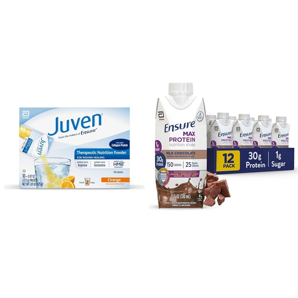 Juven Therapeutic Nutrition Drink Mix Powder for Wound Healing Support, Includes Collagen Protein, Orange, 30 Count Juven is a therapeutic nutrition powder with a blend of key ingredients to help support wound healing for burns, pressure and diabetic foot ulcers, surgical incisions, and other acute wounds. Juven's unique blend of ingredients includes HMB, Arginine, Glutamine, Hydrolyzed Collagen Protein, and micronutrients vitamins C, E, B12, and Zinc. Juven has been clinically show to support wound healing in as little as two week in healthy elderly.1 Administer orally or as a modular via feeding tube. Lactose-free, Gluten-free and Kosher. Precautions: Not for sole source nutrition Not for IV use †Has Arginine and Protein (Hydrolyzed Collagen) for wound healing. References: 1. Willams JS, et al. Ann Surg. 2002 236(3):369-375. 2. Lee SK, et al. Adv Skin Wound Care. 206 19(2):92-96. 3. Sugihara F, et al. Jpn Pharmacol Ther. 2015:43(9):1323-1328. Ensure Max Protein Milk Chocolate Nutrition Shake, 30g Protein, 1g Sugar, 4g Comfort Fiber Blend, 12 Pack Ensure Max Protein nutrition shakes provide targeted nutrition to help you stay healthy, active, and energetic. Each delicious ready-to-drink shake has 30g of high-quality protein to help keep muscles strong and satisfy hunger. Ensure Max Protein also has 150 nutritious calories, plus 25 essential vitamins and minerals, including vitamins A and D, zinc, and antioxidants (vitamins C and E) to support immune health. From Ensure, the 1 doctor-recommended brand.† Enjoy our new flavors Creamy Peach Cherry Cheesecake. This product is gluten-free and suitable for lactose intolerance.‡† Among doctors who recommend liquid nutritional products to their patients. ‡ Not for people with galactosemia. In select stores. The SNAP (Supplemental Nutrition Assistance Program) name is a service mark of the US Department of Agriculture. USDA does not endorse any goods, services, or enterprises.Product 2: - IMMUNE SYSTEM SUPPORT: An excellent source of zinc, vitamins A D, and antioxidants (vitamins C E and selenium) for immune system support. Product 2: - SUPPORTS DIGESTIVE HEALTH: Contains 4g comfort fiber blend with 1g prebiotic fiber to support digestive health. Product 2: - 25 VITAMINS MINERALS: Formulated with nutrients to support immune, bone, and brain health, as well as energy metabolism. Product 2: - 30g PROTEIN 1g SUGAR: Each Ensure Max Protein shake has 30g protein to help build muscle and satisfy hunger. Product 1: HMB: With HMB to protect muscle cells and preserve muscle tissue. Product 1: VITAMINS: Has vitamins C, E, B12, and zinc, which support immune function and wound healing. Product 1: AMINO ACIDS: Contains arginine to promote nutrient-rich blood flow, and glutamine to help the body build new tissue. Product 1: SUPPORTS WOUND HEALING: Provides essential nutrients clinically shown to support wound healing by enhancing collagen production in as little as 2 weeks.