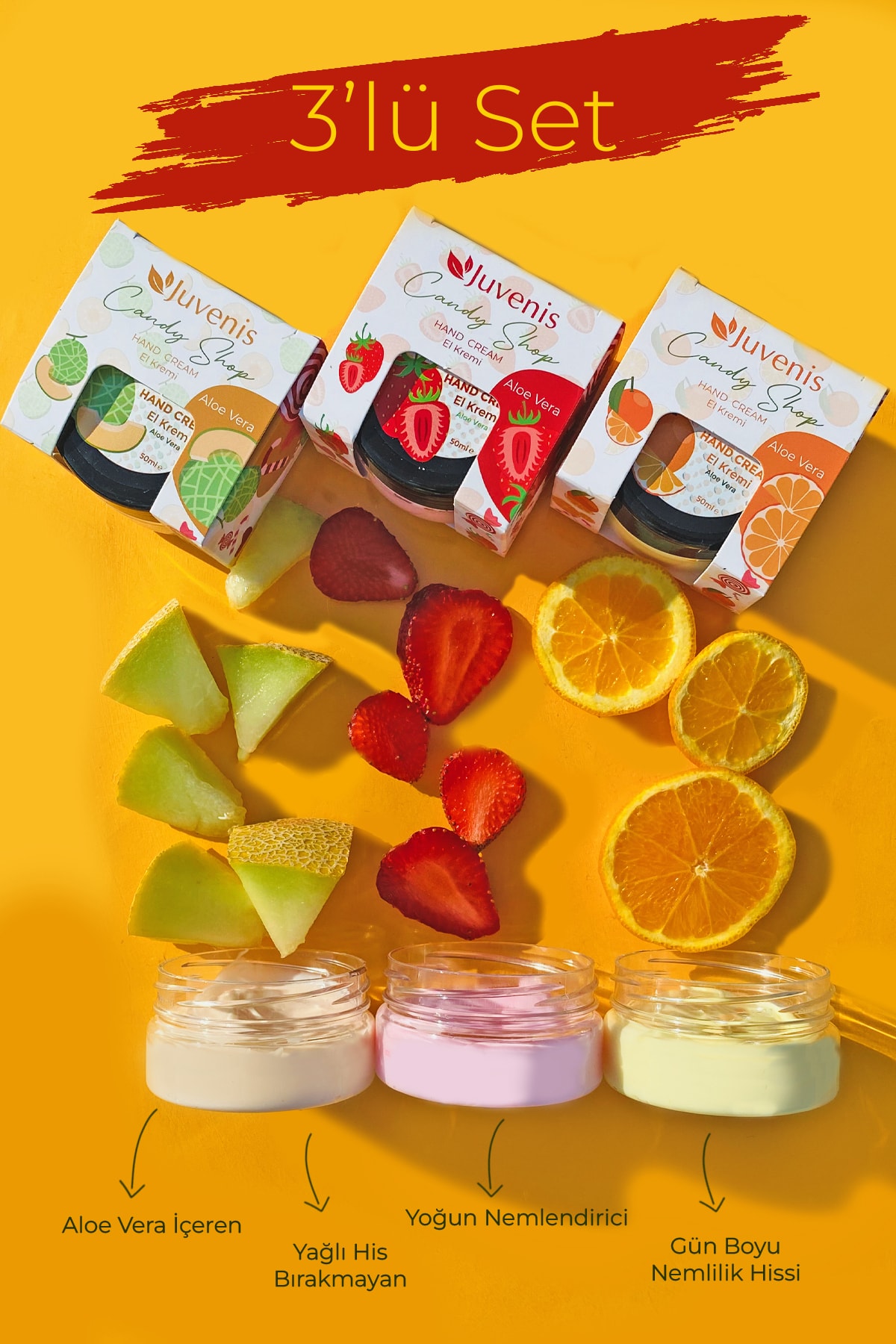 • Juvenis Candy Shop Çilek, Portakal ve Kavun Aromali Yogun Nemlendirici Parabensiz Allantoin ve AloeVerali Pürüzsüzlestiren El Kremi 50ml