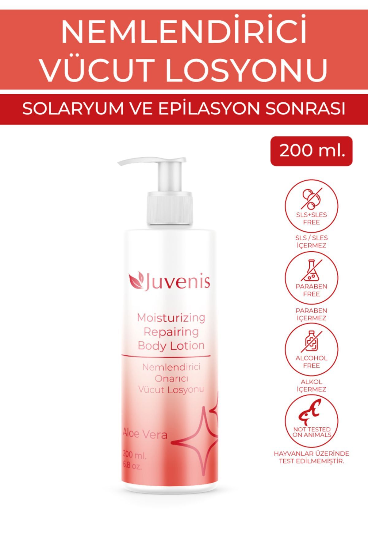 • Juvenis Nemlendirici ve Onarici Vücut Losyonuagda, epilasyon, lazer ve solaryum sonrasi olusan hassasiyeti ve kizarikligi gidermeye yardimci olur.
