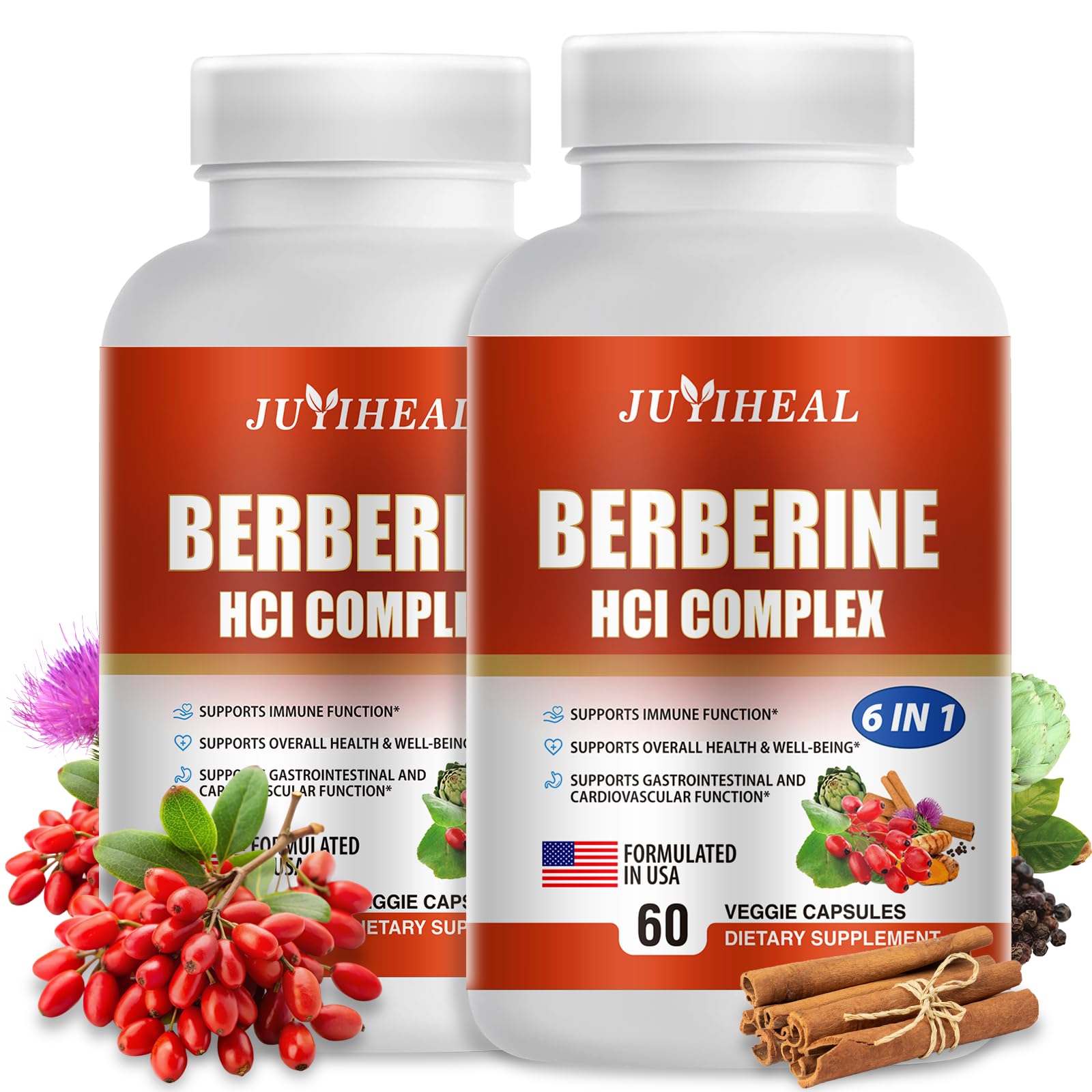 • JUYIHEAL Berberine Supplement 505mg, contains 200mg Berberine HCl 150mg Ceylon Cinnamon 50mg Milk Thistle 50mg Artichoke 50mg Turmeric 5mg Black Pepper, a vegan and powerful formula to provide your body with the herbal support it needs