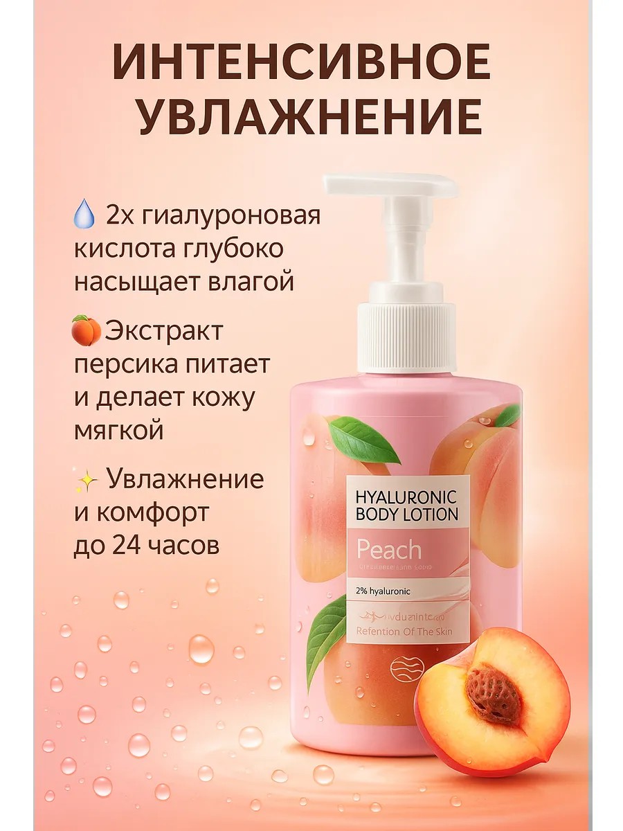 Фруктовое увлажняющее молочко для тела с ароматом сочного персика — идеальное средство для комплексного ухода за кожей тела, рук и ног. Легкая, нежная текстура быстро впитывается, не оставляя липкости и жирного блеска. Формула с гиалуроновой кислотой интенсивно увлажняет, а экстракт персика питает кожу, придавая ей мягкость и шелковистость. Средство помогает удерживать влагу до 24 часов, делая кожу упругой и гладкой. Подходит для ежедневного применения и для всех типов кожи, в том числе чувствительной. Лосьон легко распределяется, освежает и придает легкий фруктовый аромат, который сохраняется на коже в течение всего дня. Отлично подходит после душа или ванны, особенно в холодное время года, когда коже требуется дополнительное питание. Стильный флакон с помпой удобен в использовании и экономно расходует продукт.