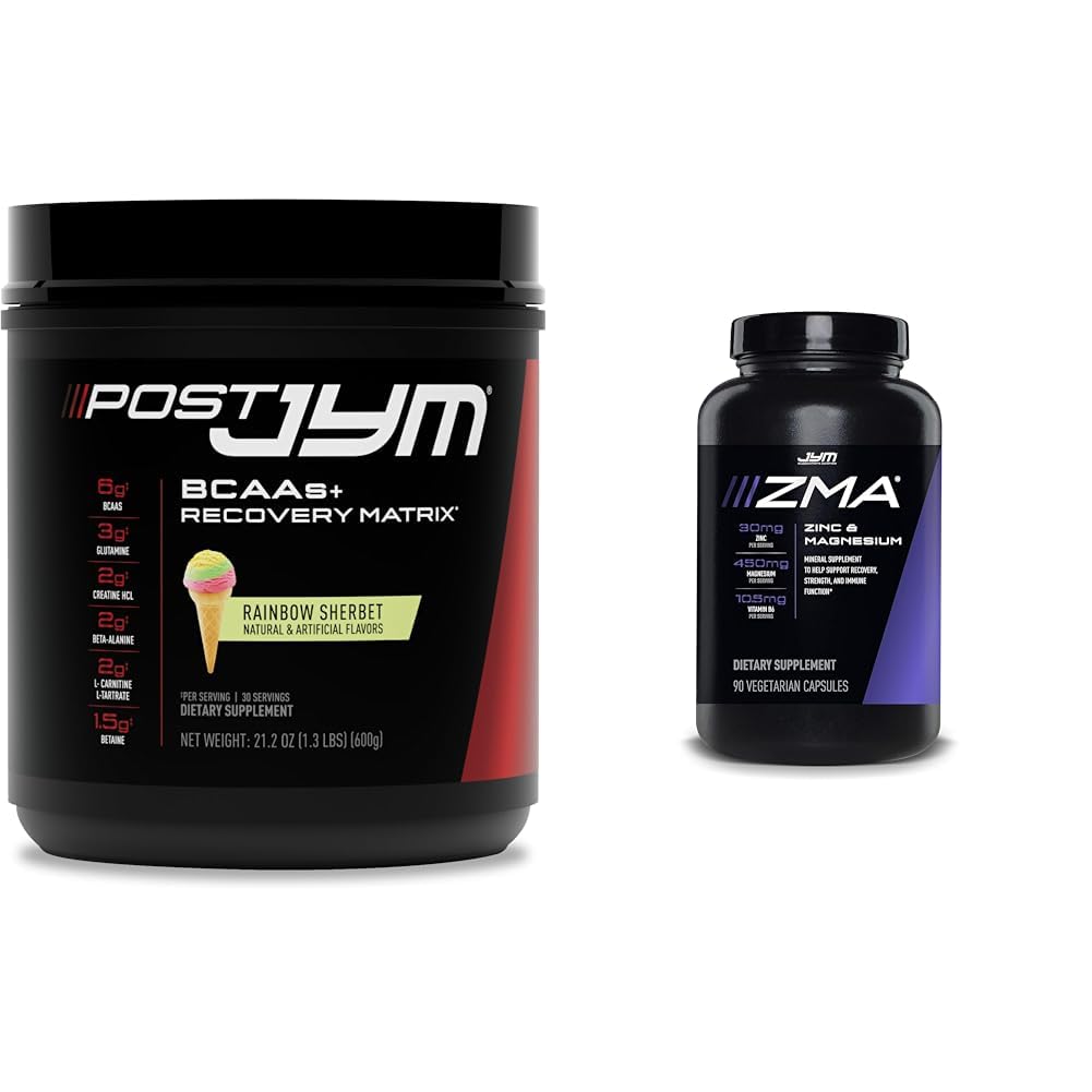 This 30-serving tub of Post JYM Active Matrix post-workout supplement combined with a 90-capsule bottle of ZMA JYM zinc and magnesium supplement makes for a complete muscle recovery and growth stack. Post JYM contains 8 ingredients including branched chain amino acids (BCAAs), beta-alanine, creatine HCl, and betaine to boost protein synthesis and maximize muscle growth when taken after workouts. It also includes carnitine and glutamine to enhance muscle tissue repair. With only 45 calories per serving, Post JYM provides a delicious, refreshing drink to aid faster recovery after intense training. ZMA JYM delivers highly bioavailable forms of zinc, magnesium, and vitamin B6, which many hard-training athletes are deficient in. Proper zinc and magnesium levels are critical for maintaining peak testosterone levels and gaining strength. ZMA JYM uses zinc mono-L-methionine, magnesium aspartate, and Bioperine to optimize mineral absorption. Together, these two supplements provide both the immediate muscle recovery and anabolic support (Post JYM) along with the hormonal environment and nutrient support (ZMA JYM) needed for making consistent gym progress. The featured ingredients in both products complement each other to create a simple yet complete bundle for anyone looking to boost post-workout results.