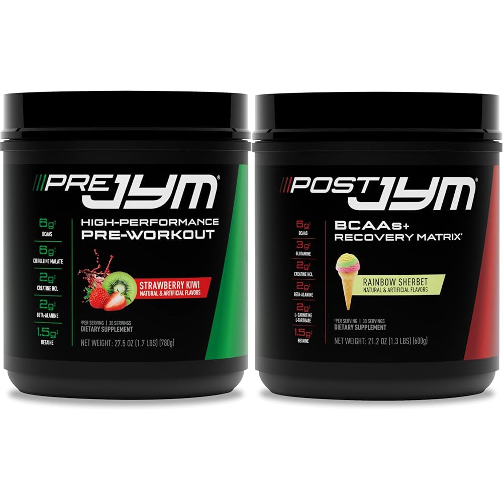 JYM Supplement Science PRE JYM 30 Servings - Strawberry Kiwi & - Post-Workout with BCAA's, Glutamine, Creatine HCL, Beta-Alanine, and More Rainbow Sherbert Flavor, 30 Servings, 21.2 oz.