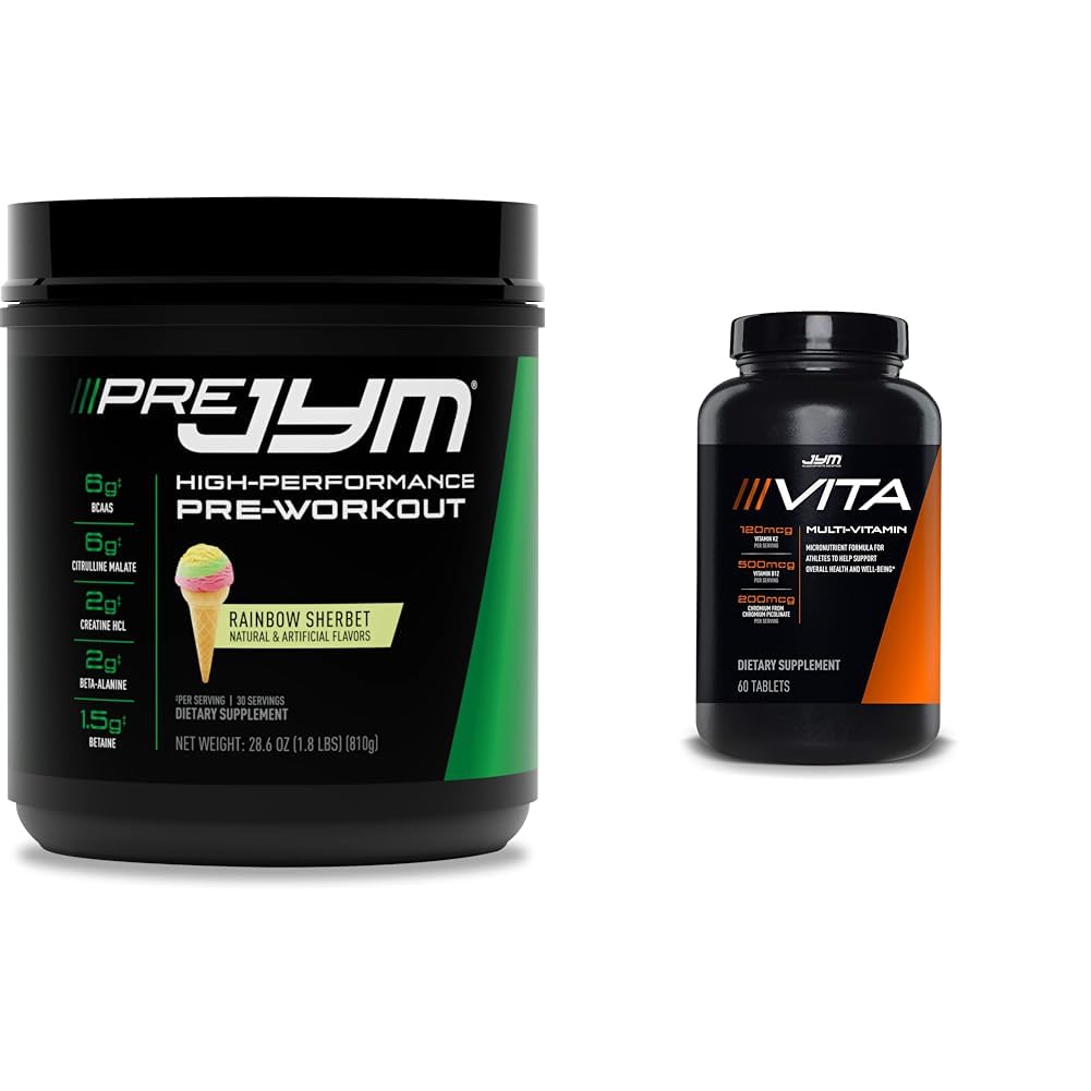 Great taste - Pre JYM comes in a delicious Rainbow Sherbet flavor that mixes easily in water for a pre-workout drink you'll look forward to. Maximized absorption - Vita JYM strategically excludes minerals like zinc and calcium that can interfere with nutrient uptake for better utilization of vitamins. Enhanced athletic performance - Vita JYM contains over 25 key micronutrients to support energy, recovery, strength and endurance for hard-training athletes. Supports muscle growth - The BCAAs, Creatine HCI and Betaine in Pre JYM can help stimulate muscle protein synthesis for greater muscle growth. Quality ingredients - Pre JYM pre-workout powder contains BCAAs, Creatine, Citrulline Malate, Caffeine and more to optimize your workout and fuel your muscles.