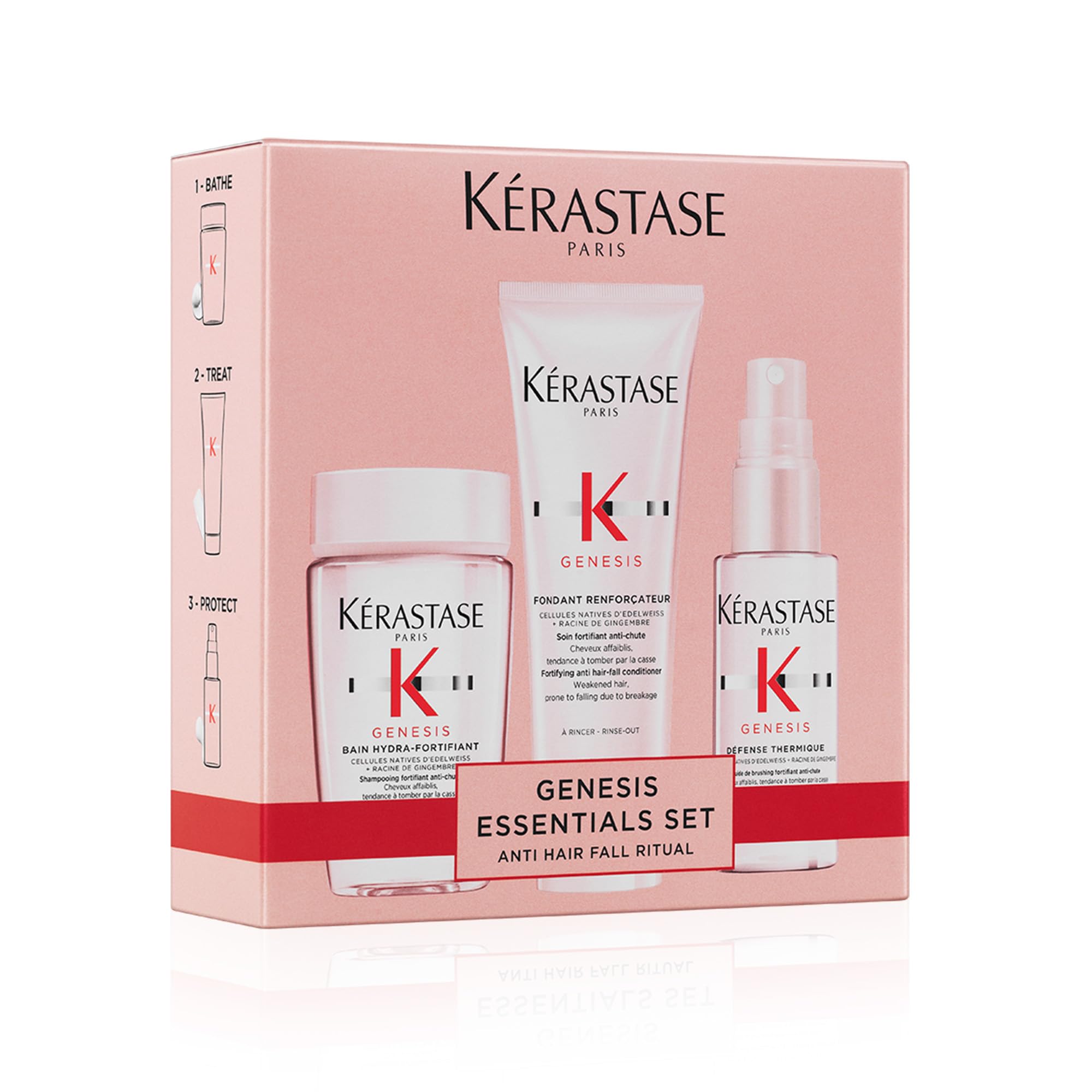 CUSTOMIZED HAIR CARE: Drawing on its professional expertise, Kérastase creates customizable treatments to meet the needs of every hair type, thanks to innovative products adapted to each hair's specific needs. ANTI-HAIR LOSS PROTOCOL: Apply Bain Hydra Fortifiant to wet hair, then massage into the scalp. Rinse and repeat. Next, apply Fondant Renforçateur. Rinse. Finish with the Défense Thermique serum before drying and straightening. REDUCED HAIR LOSS DUE TO BREAKAGE: The Kérastase Genesis protocol reduces hair loss due to breakage during brushing by 97 . Hair is denser and healthier. FORMULA BASED ON NATURAL INGREDIENTS: The Kérastase Genesis protocol contains treatments based on edelweiss native cells, which soothe and strengthen the hair fiber, and ginger root, which stimulates and protects the scalp. PROFESSIONAL ANTI-HAIR LOSS CARE FOR BRITTLE HAIR: Comprising the Bain Hydra Fortifiant professional shampoo, the Fondant Renforçateur and the Genesis Thermique Defense serum, this protocol reduces hair loss due to breakage.DES SOINS CAPILLAIRES SUR-MESURE : Forte de son expertise professionnelle, Kérastase crée des soins personnalisables pour répondre aux besoins de chaque typologie de cheveux grâce à des produits innovants adaptés à chaque spécificité capillaire. PROTOCOLE ANTICHUTE : Appliquer le Bain Hydra Fortifiant sur cheveux mouillés, puis masser le cuir chevelu. Rincer et recommencer. Appliquer ensuite le Fondant Renforçateur. Rincer. Finir avec le sérum Défense Thermique avant séchage et lissage. PERTE DE CHEVEUX DUE A LA CASSE REDUITE : Le protocole Kérastase Genesis réduit la chute des cheveux due à la casse durant le brossage de 97 . Les cheveux sont plus denses et en bonne santé. FORMULE A BASE D'INGREDIENTS NATURELS : Le protocole Kérastase Génésis contient des soins à base de cellules natives d'edelweiss qui apaisent et renforcent la fibre capillaire et de racine de gingembre qui stimule et protège le cuir chevelu. SOINS PROFESSIONNELS ANTICHUTE POUR CHEVEUX CASSANTS : Se composant du shampoing professionnel Bain Hydra Fortifiant, du Fondant Renforçateur et du sérum Défense Thermique Genesis, ce protocole réduit la chute des cheveux due à la casse.KÉRASTASE Genesis - Routine Nourissante Anti-Casse pour Cheveux Fragiles - Renforce Réduit la Casse - Aminexil Coffret Découverte