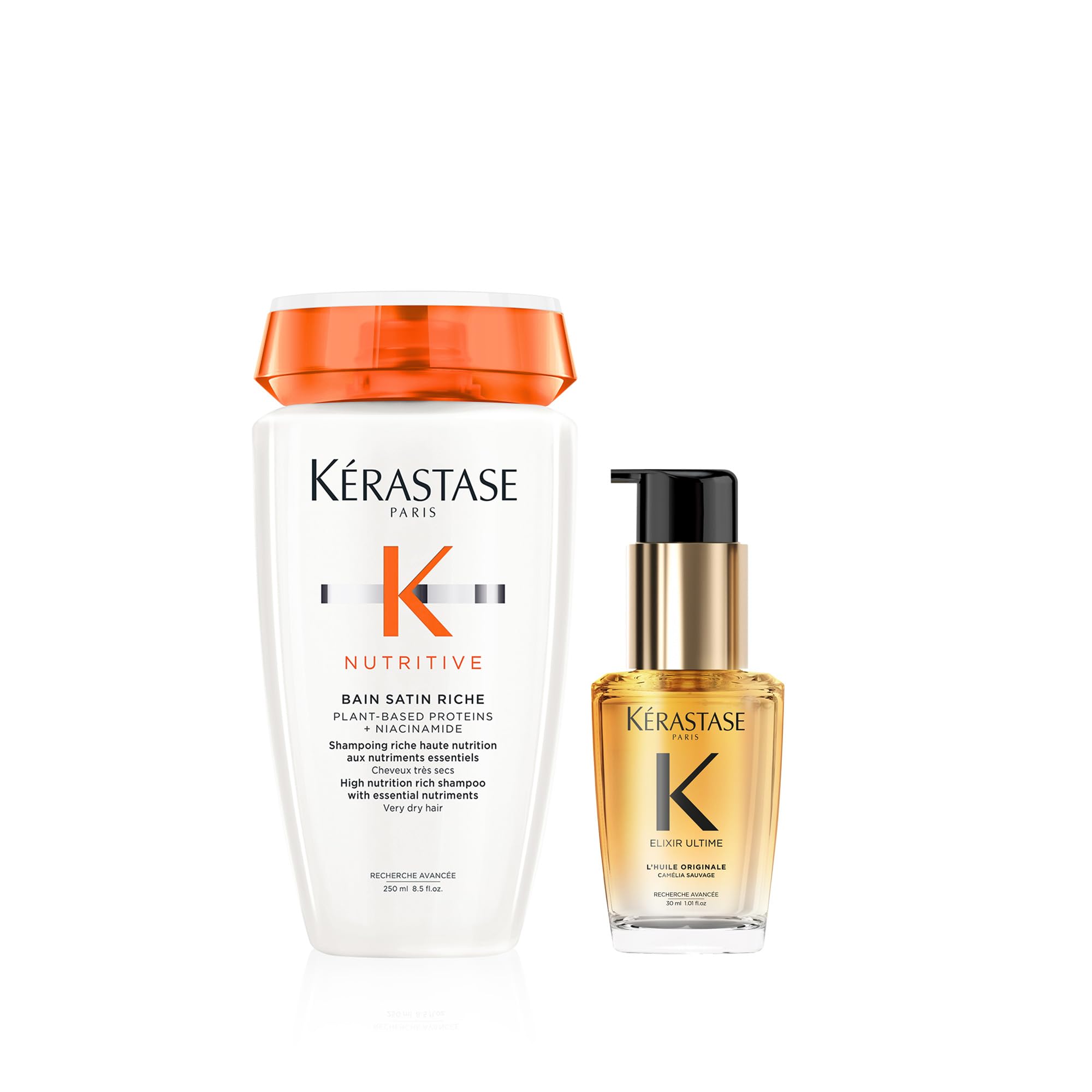 Apply the shampoo, lather, then rinse. Repeat. On towel-dried or dry hair, distribute one or two pumps of the oil through the lengths and ends. Do not rinse. This routine, enriched with plant proteins, deeply nourishes the hair fiber and strengthens the hair's natural protective barrier for added shine. Nutritive is the professional hair care range for all dry hair types. This two-step routine consists of a shampoo and a refillable, beautifying Elixir Ultime oil.Appliquer le shampoing, émulsionner puis rincer. Répéter. Sur cheveux essorés ou secs, répartir une à deux pressions de l'huile sur les longueurs et les pointes. Ne pas rincer. Cette routine enrichie en protéines végétales nourrit la fibre capillaire en profondeur et renforce la barrière protectrice naturelle des cheveux pour plus de brillance. Nutritive est la gamme de soins capillaires professionnels pour tous les cheveux secs. Cette routine en deux étapes se compose d'un shampoing et d'une huile sublimatrice rechargeable Elixir Ultime.KÉRASTASE Nutritive Élixir Ultime - Routine Nourrissante Sublimatrice pour Cheveux Secs - Shampoing Bain Satin Riche (250 ml) Huile Originale (30 ml)