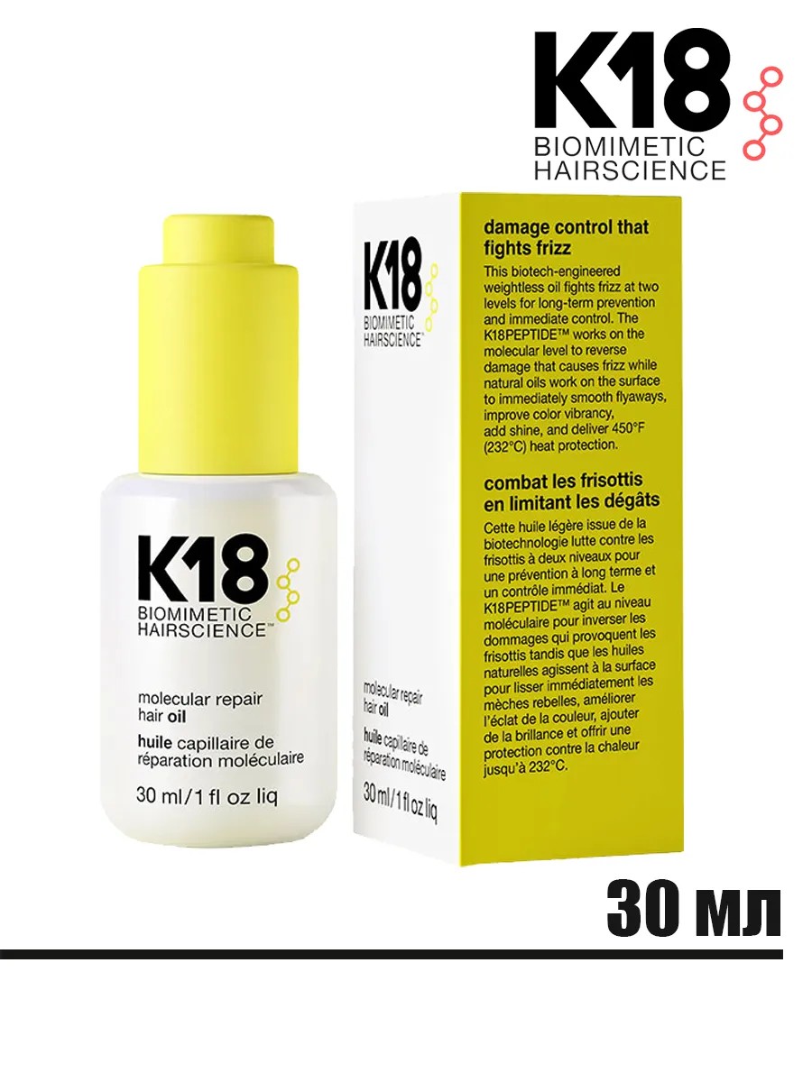 K18 Molecular Repair Hair Oil is the best assistant in creating unrivaled smooth and shiny hair. K18 Hair Oil is a hair care product that helps strengthen and restore damaged hair on two levels, reduces frizz and seals split ends. K18 is a new development by American beauty technologists for healthy shine and protection of your hair at the molecular level: K18 PEPTIDE acts on the deeper damage that causes frizz, restoring and strengthening damage in the inner layer of the hair to reverse the damage that leads to frizz. Smoothing molecular hair oil from the USA contains avocado and sunflower oils, as well as hemisqualane and squalane, which not only nourish and smooth hair, but also preserve the brightness of the color of colored hair and provide heat protection up to 232°C. By purchasing professional oil for hair ends K18 without silicones and parabens, you get: clinically proven damage correction; 24-hour fight against frizz; 104% more shine; 78% fewer split ends; 450°F (232°C) heat protection—and that's not all the benefits of K18 Molecular Repair Hair Oil.